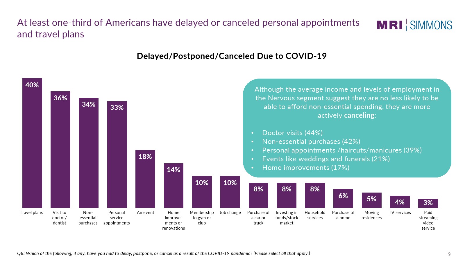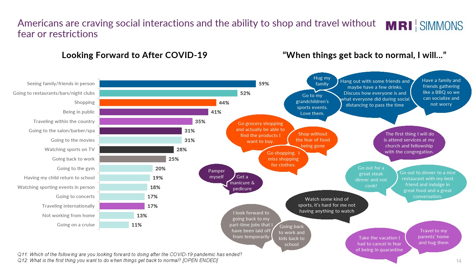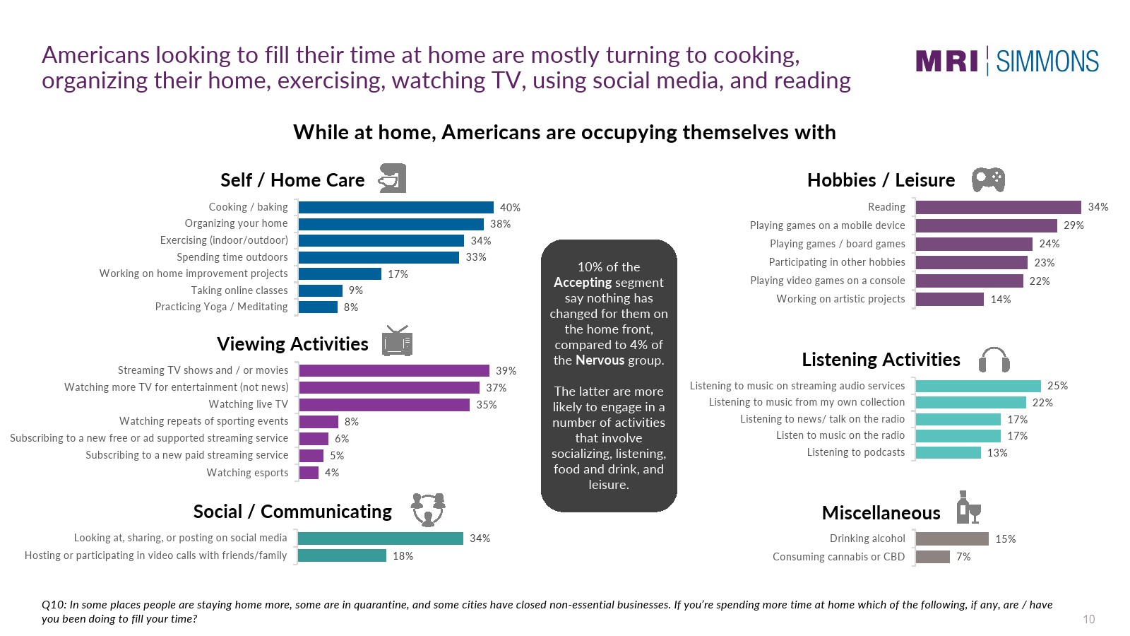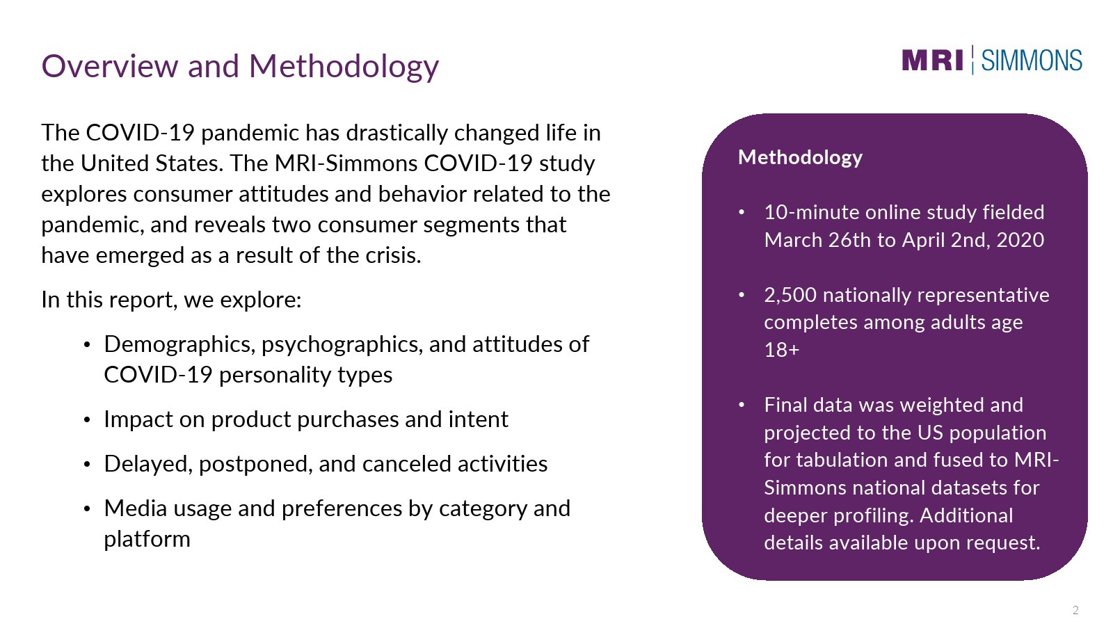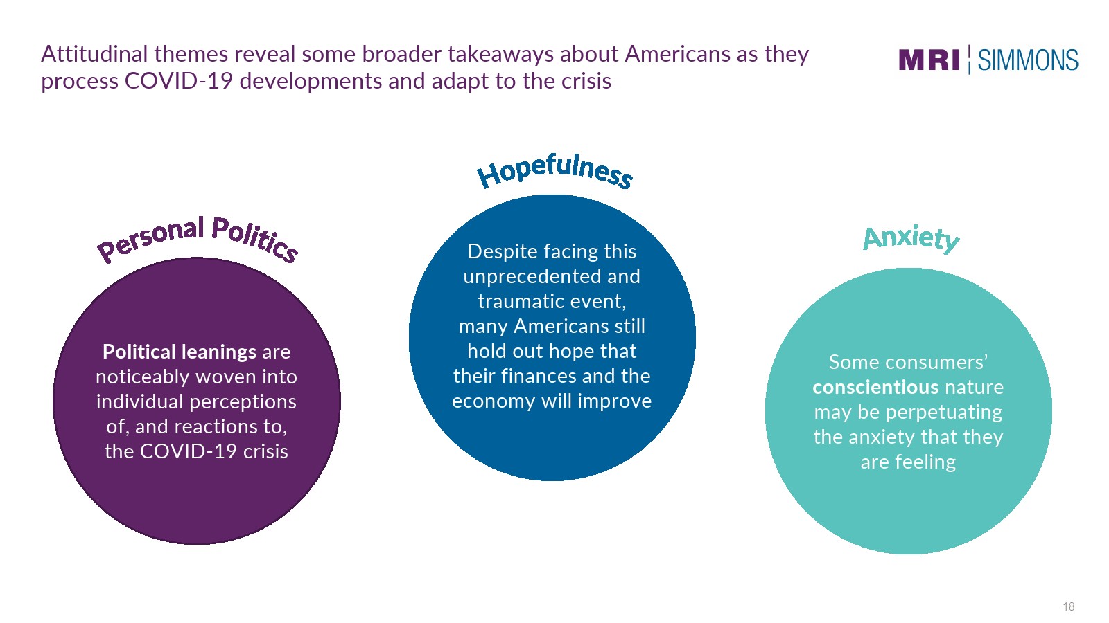 MRI-Simmons对冠状病毒危机导致的消费者行为和态度改变进行了深入分析。此次调查覆盖MRI-Simmons具有全国代表性的数据集,为营销人员和媒体提供6万个消费者元素的更深层次的剖析,包括数百个心理特征、产品类别和数千个品牌。