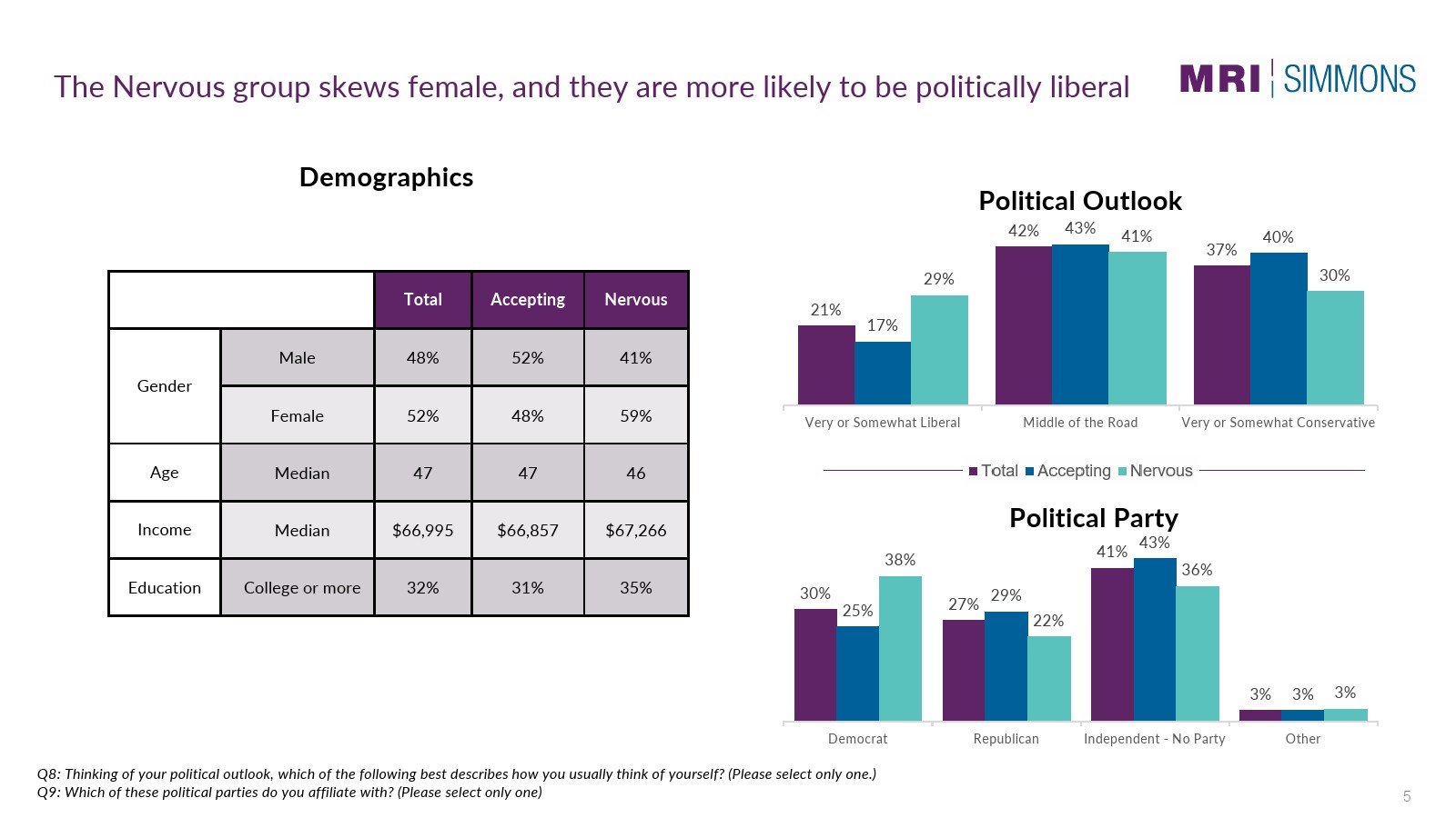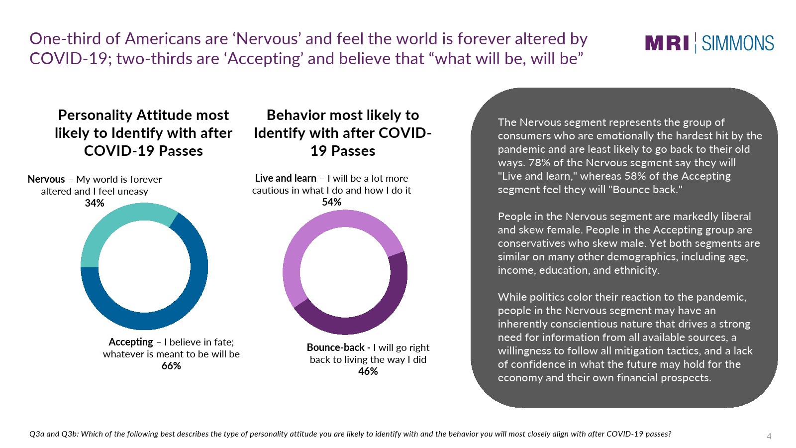 1/3的美国人属于“紧张”类别,他们觉得世界永远被冠状病毒改变了。这些消费者偏向女性,年龄平均为46岁,更倾向于自由派。相比之下,2/3的消费者属于“接受”类别,相信“会是什么,就会是什么”。这些消费者偏向男性,年龄平均为47岁,而且更倾向于保守。