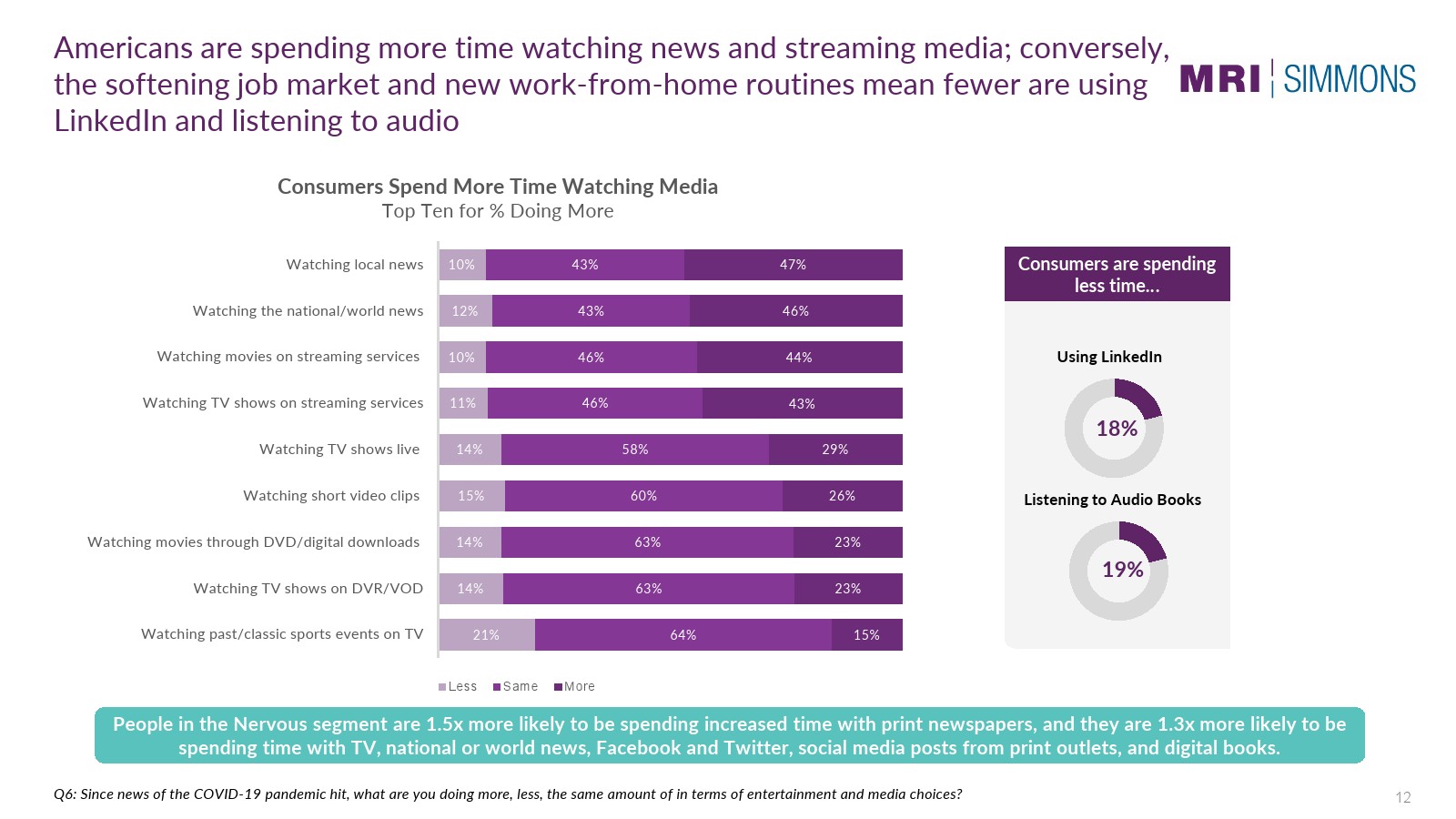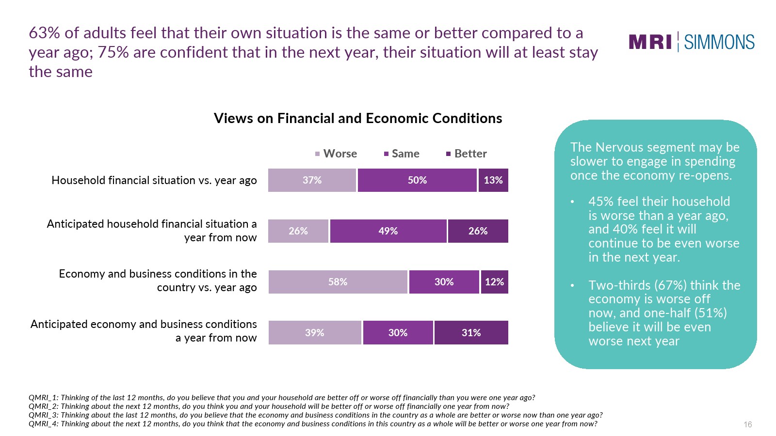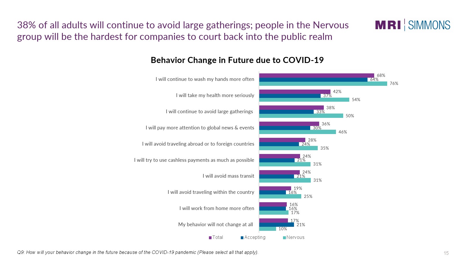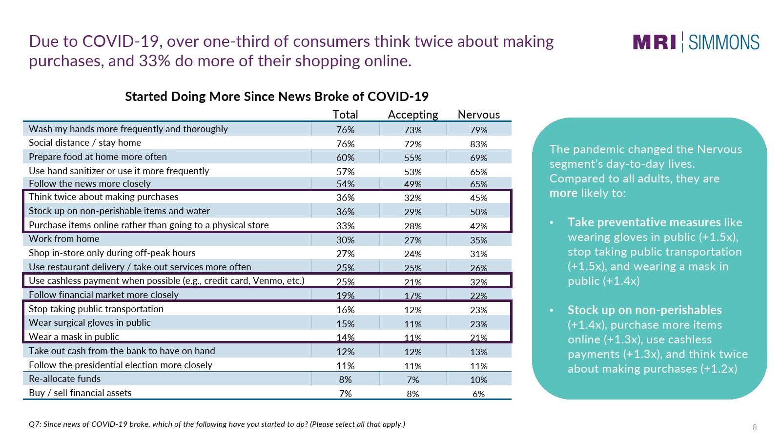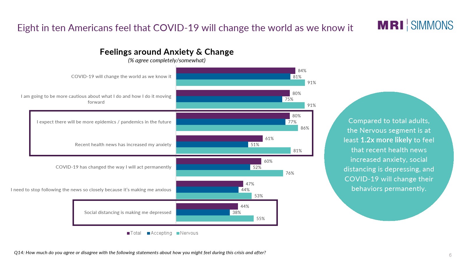 与所有成年人相比,处于“紧张”类别的消费者感到最近的健康新闻增加了他们的焦虑、社交距离让他们变得抑郁、冠状病毒将永久性地改变他们的行为,这个群体这么认为的可能性至少是其他成年人的1.2倍。