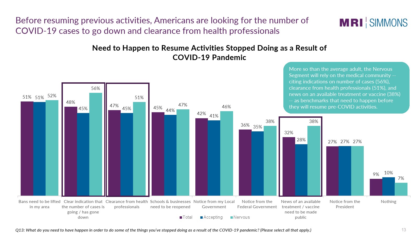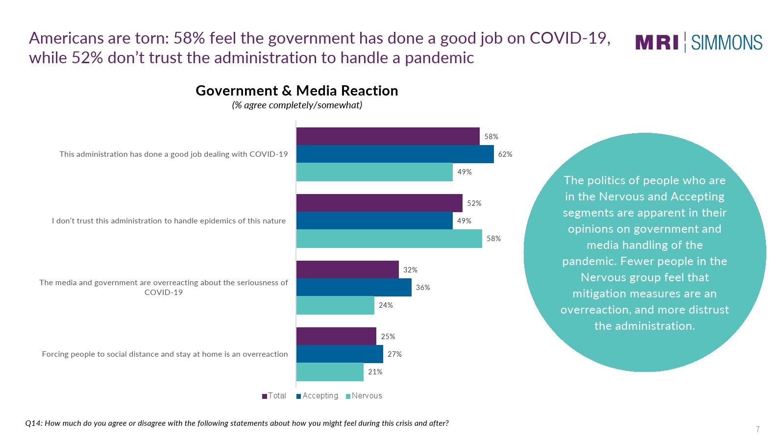 “紧张”和“接受”对政府和媒体处理疫情的看法也不同。很少有“紧张”类别的消费者觉得应对措施反应过度,他们更有可能不相信政府处理像冠状病毒这样的流行病的能力。