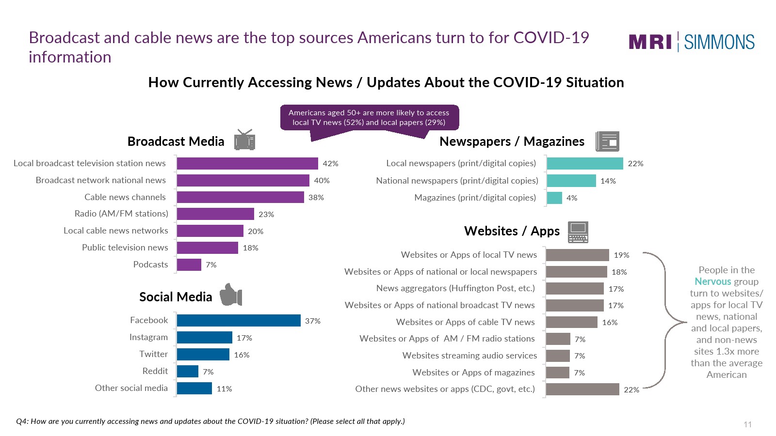 广播和有线新闻是美国人寻求冠状病毒信息的主要来源。处于“紧张”类别的消费者转向网站/应用获取地方电视新闻、全国性和地方性报纸以及非新闻网站的数量是普通美国人的1.3倍。“紧张”的受访者使用推特的次数也是普通美国人的1.2倍。