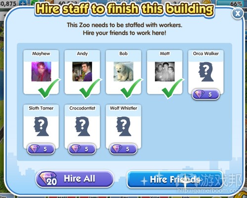 重新回到好友请求:我希望能够自己安置建筑中的职工,并随时间发展自动满足其他好友的请求,但单人玩家也并非毫无乐趣可言。我还想使用更便捷的方法找到活跃玩家,让他们组队一起玩游戏,即使他们并非彼此的Facebook好友。我们已经看到Zynga在这方面的努力,但这种设置应该在所有含大量好友请求的社交游戏中普及。