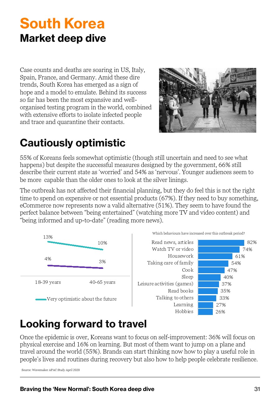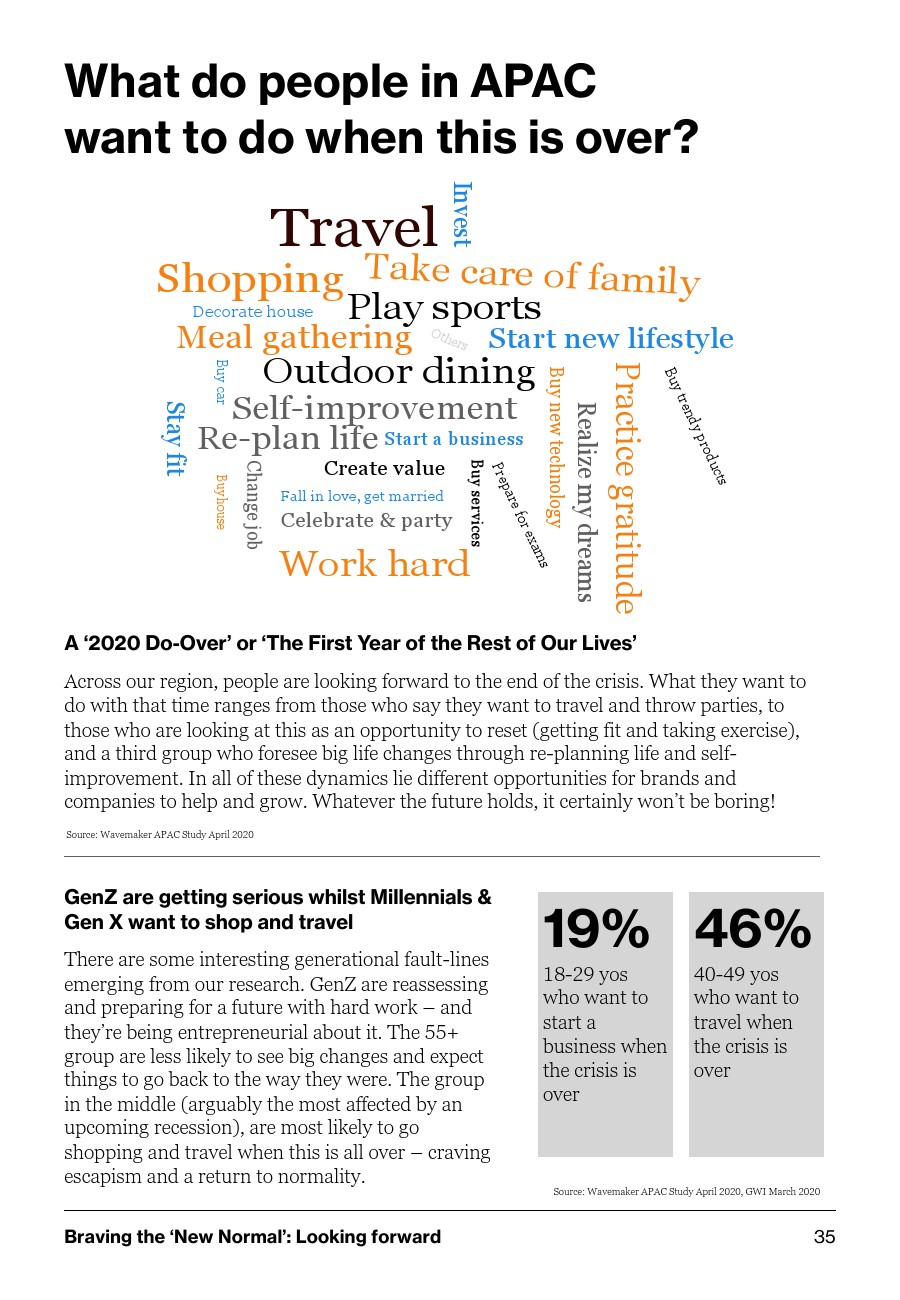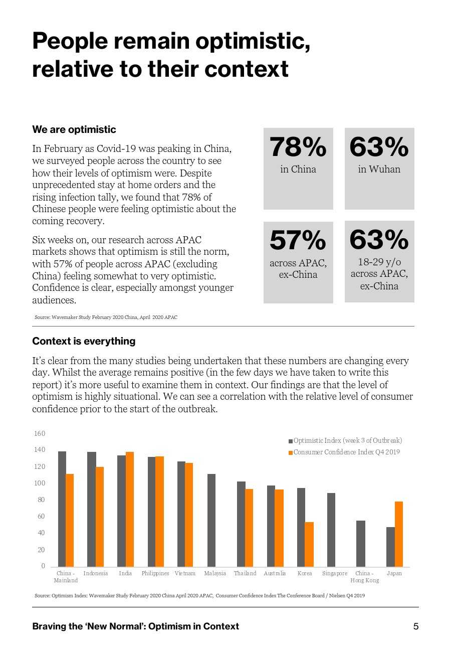 Wavemaker发布了一份新报告”勇敢地接受‘新常态’”。研究人员发现,在COVID-19疫情危机期间,人们普遍保持着乐观情绪。78%的中国受访者和63%的武汉受访者表示,即使在2月份疫情最严重的时候,他们也很乐观。在高峰期过去六周后,该地区(不包括中国)57%的消费者对未来仍持积极或非常积极的态度,这一趋势在18-29岁的年龄段中最为明显。