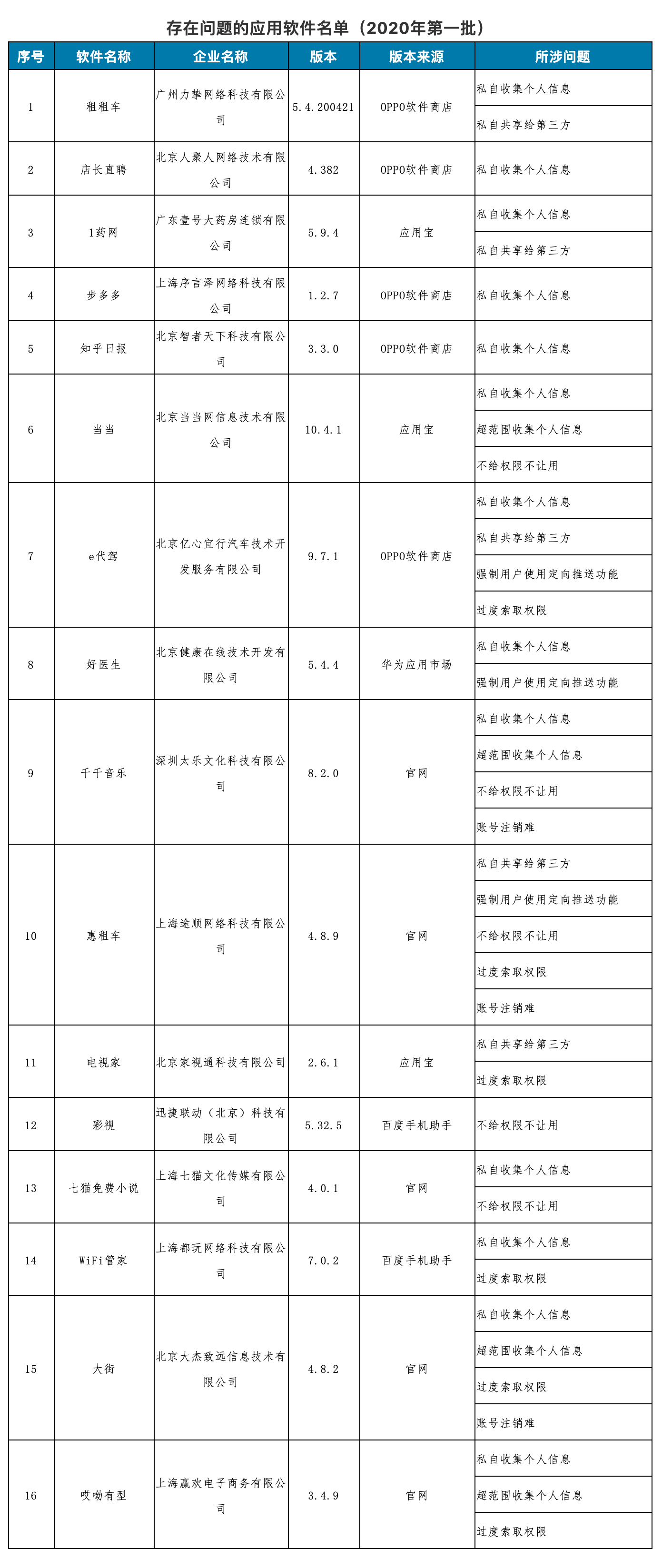 工信部通报2020年第一批侵害用户权益行为APP 依据《网络安全法》《电信条例》《电信和互联网用户个人信息保护规定》等法律法规,我部近期组织第三方检测机构对手机应用软件进行检查,对发现存在问题的企业进行督促整改。截至目前,尚有16款APP未完成整改(详见附件)。上述APP应在5月25日前完成整改落实工作,逾期不整改的,我部将依法依规组织开展相关处置工作。 更多阅读:工信部:2019年4月电话用户分省情况工信部:2022上半年我国信息消费规模3.24万亿元工信部:2017年电子信息制造业运行情况工信部:2020年软件和信息技术服务业统计公报主要指标表工信部:2021年4月电话用户分省情况工信部:2020年第四季度通信业主要通信能力工信部:2020年12月电话用户分省情况工信部:2018年3月通信业主要指标完成情况工信部:2018年4月电话用户分省情况工信部:2018年Q1通信业主要通信能力工信部:2018年3月电话用户分省情况工信部:2018年春节期间移动数据流量消费增长超两倍工信部:2018年2月通信业主要指标完成情况工信部:2017年软件业经济运行情况工信部:2020年1-7月软件业经济运行数据情况