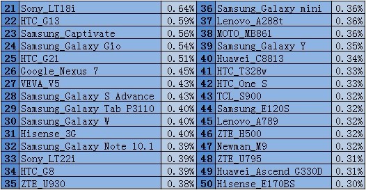 HTC 系列手机和上月没有变化,虽然前十名仅占据两席,但凭借着“机海战术”依然保持着对安卓市场的影响力。SONY旧旗舰LT26i和摩托罗拉经典三防机 ME525依旧在前二十名中占有一席之地,不过名次有所下滑,索尼和摩托罗拉复兴的希望可能要寄托在Xperia Z和XPhone之上了。