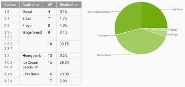 在2013年安卓系统版本分布方面,4.0之前的系统大幅度缩水,2.2、2.3共下降了8%。而4.1 Jelly Bean“果冻豆”上升到23%,涨了8.5个百分点,增速很快。
