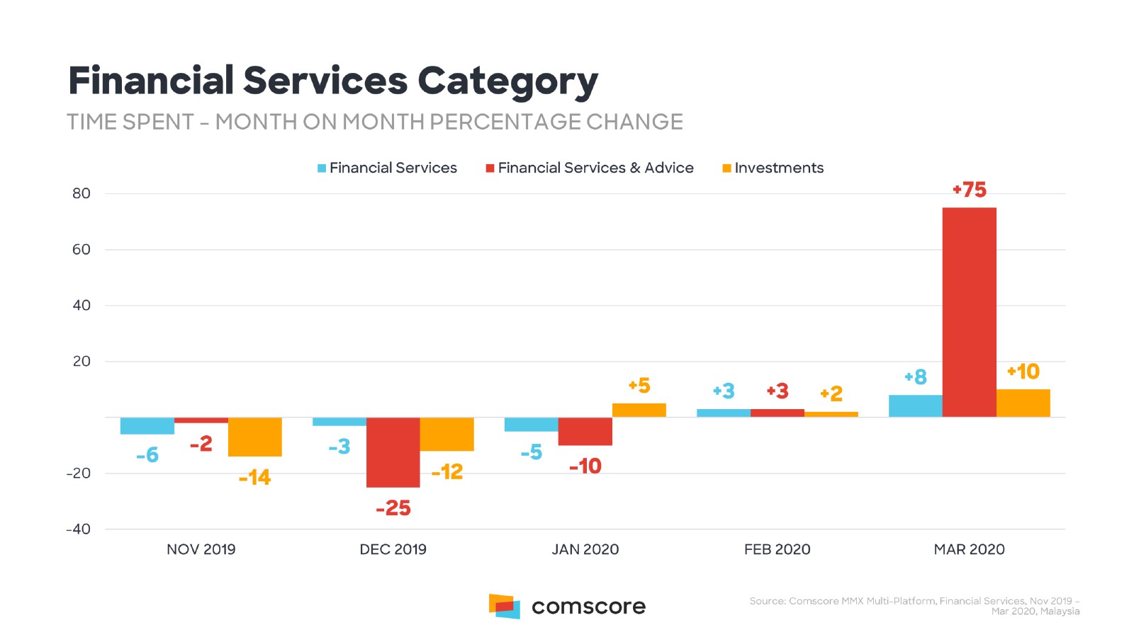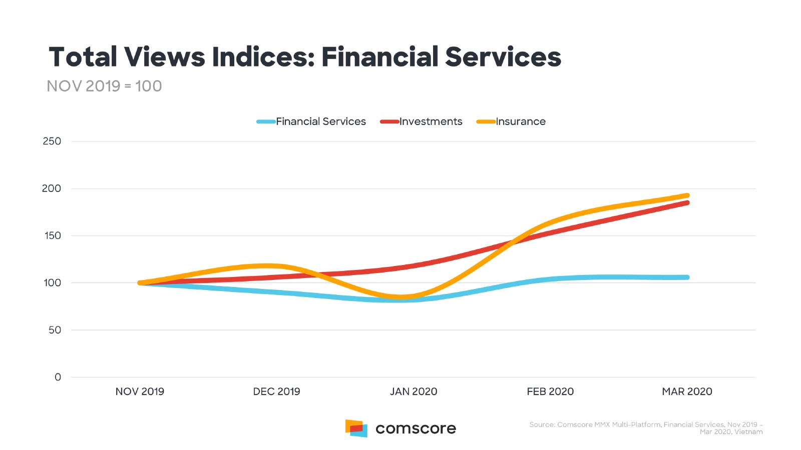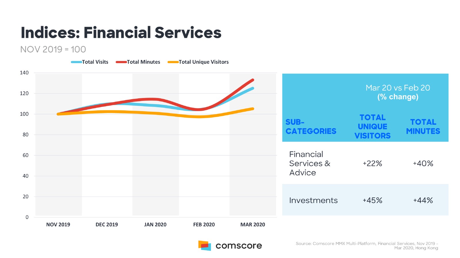 与2019年11月相比,2020年3月新闻网站的总浏览量激增了80%。关于教育的浏览量增长了53%。由于人们越来越关注冠状病毒在全球的传播,消费者访问卫生网站的数量比2月增长了27%。花在金融服务上的时间也呈增长趋势,与2月相比增长了8%。