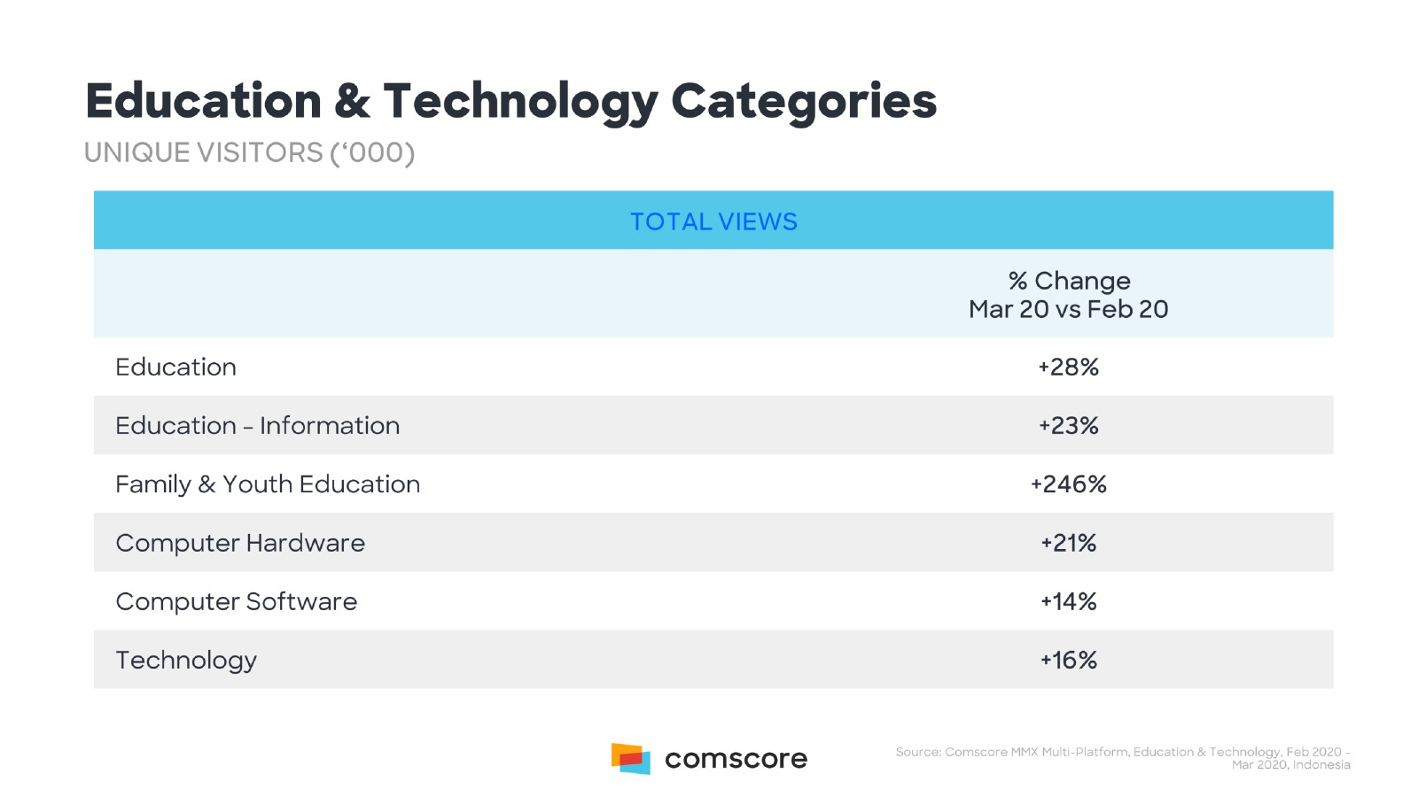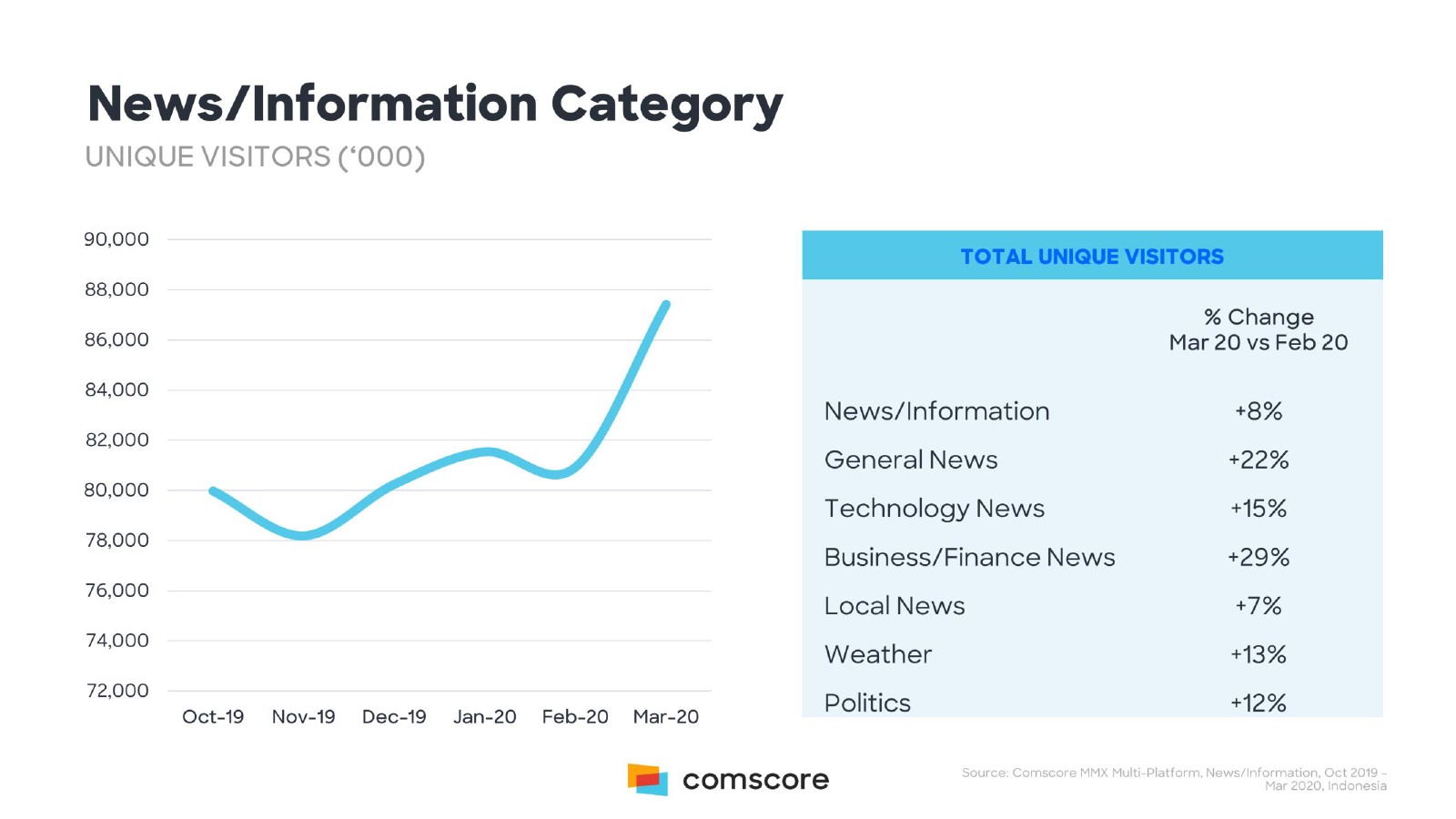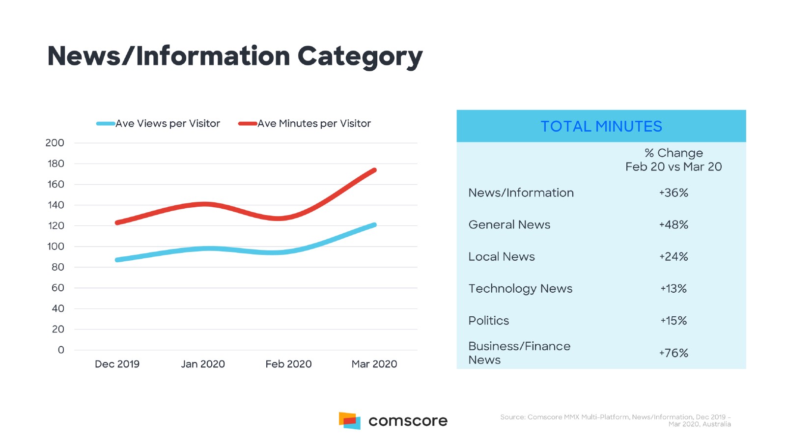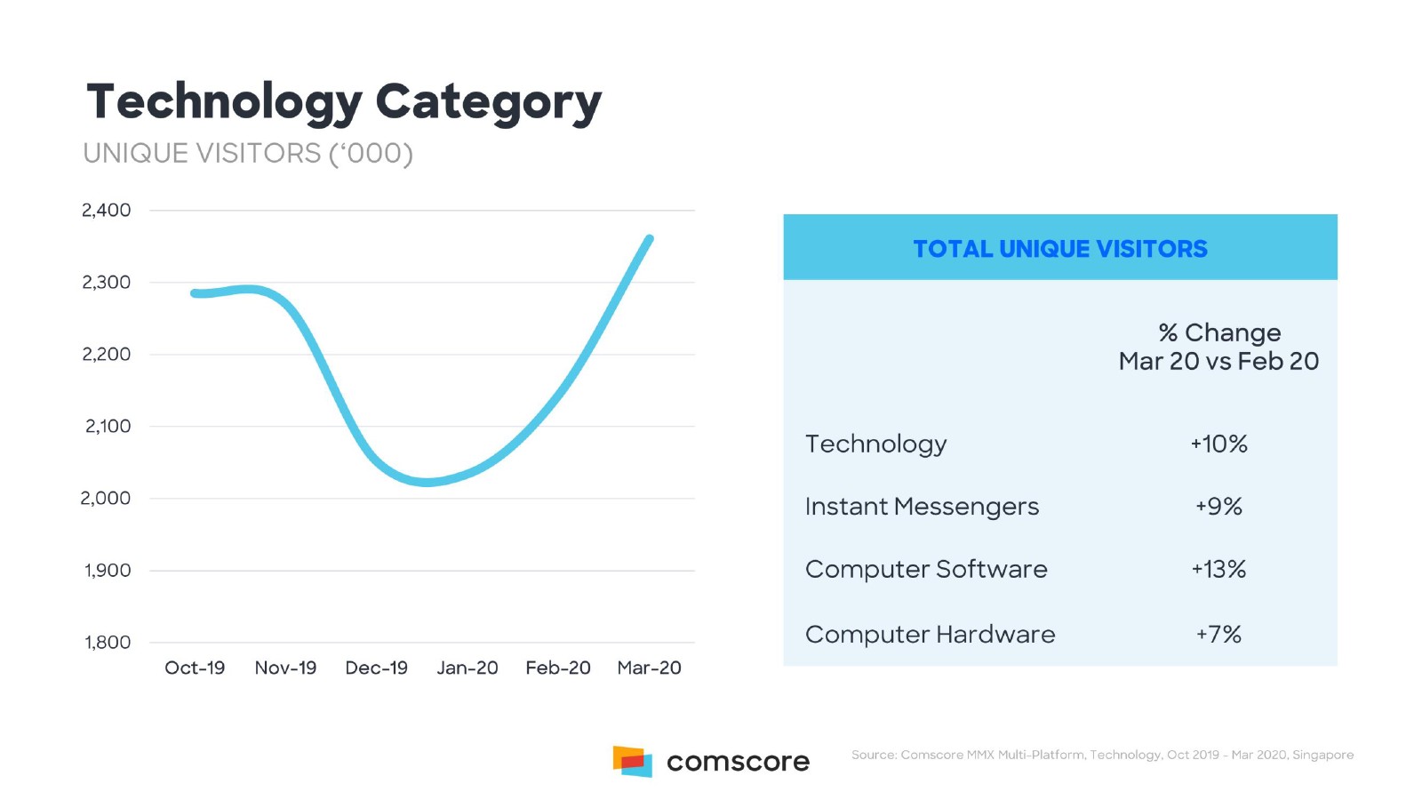本地、技术和商业/金融新闻内容出现了两位数的增长。自从在家工作以来,2020年3月技术站点的流量增长了10%。与2020年2月相比,3月娱乐和游戏访问量分别增长了12%和17%。