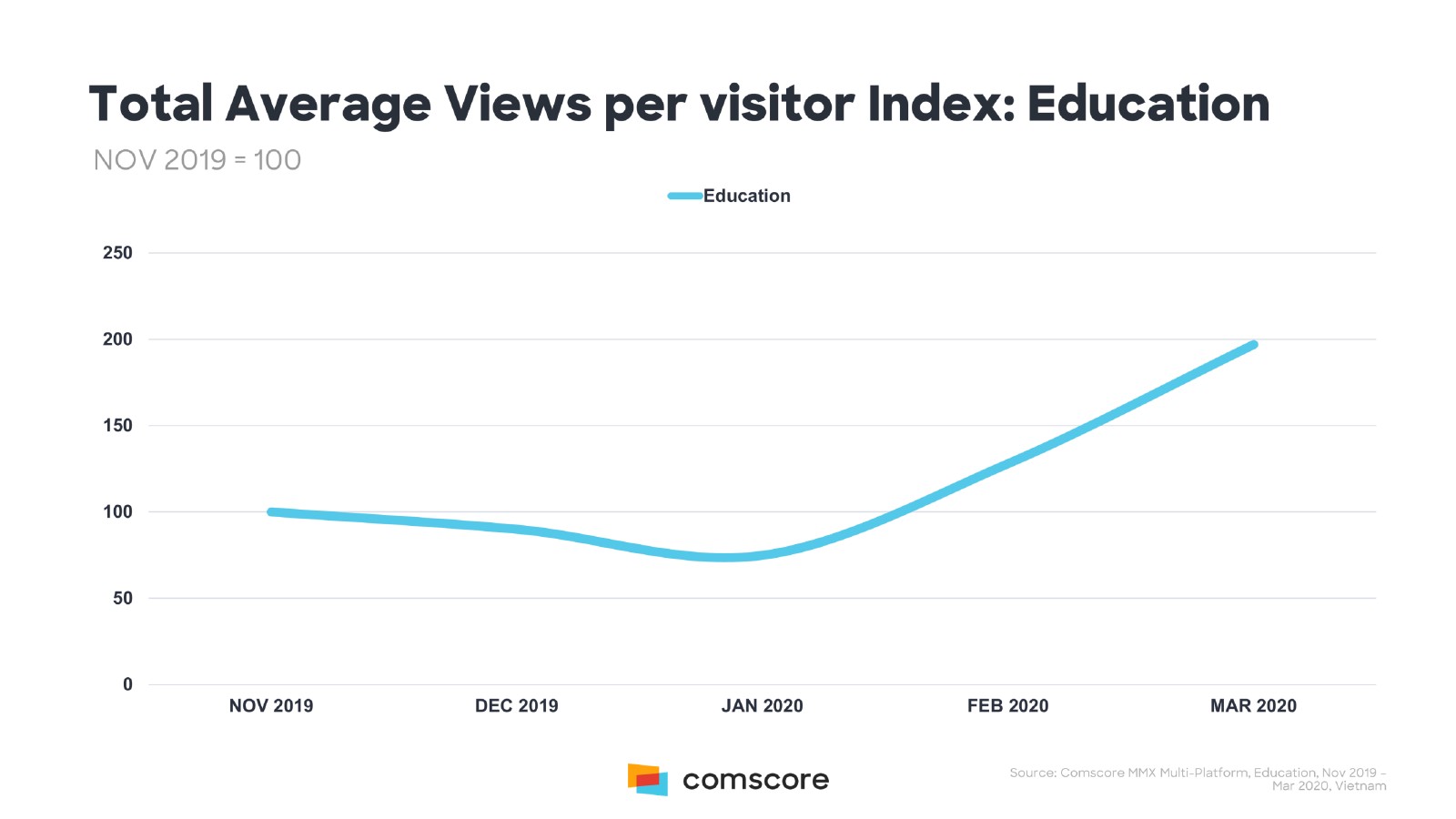 2020年3月新闻/信息网站的浏览量比去年11月增长了17%。3月每个访问者在教育网站的平均浏览量增长了97%,与2月相比增长了54%。健康网站在2020年3月的总浏览量增长了28%。
