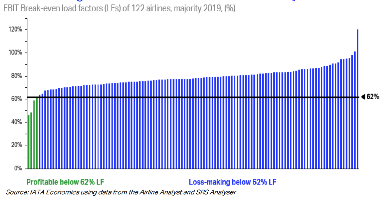 - 飞机座位率(载客率)是航空公司财务业绩的重要驱动因素。根据对122家航空公司的抽样调查,平均而言,航空公司在载客率为77%的情况下才能实现盈亏平衡。在样本中只有4家航空公司在载客率低于62%时仍可以实现收支平衡。按照目前的定价政策,其余118家航空公司在载客率低于62%的情况下将出现亏损。