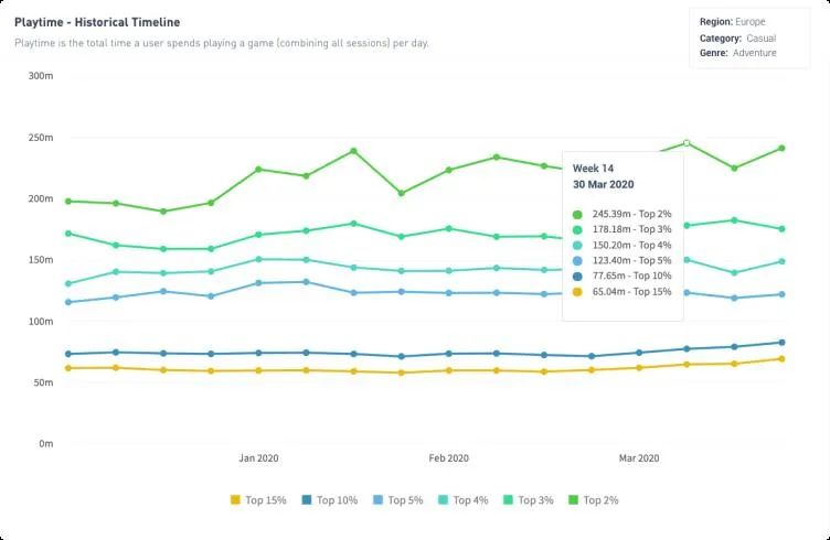 在最受欢迎的前 2% 冒险类游戏作品中,平均每位玩家的日均体验时长达到了 245 分钟,增幅达到 25%。因此可以做出一个结论——大部分玩家在隔离政策之前的在校学习时间,现如今已经被游戏所取代。