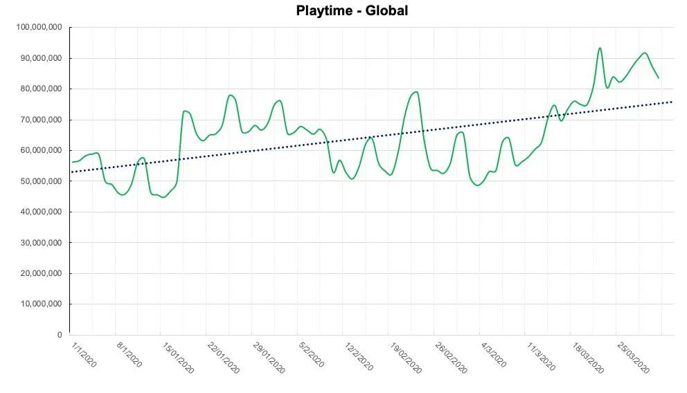 从过去三个月的数据来看,人们玩的游戏不仅更多了,时间也更长了。其中网络流量从 12 亿增长到了 17.5 亿,增幅达到了 46%,自今年 1 月到 3 月底,全球游戏体验时长增加了 62%,高峰时期每天的游戏体验总时长甚至超过了 9000 万小时。