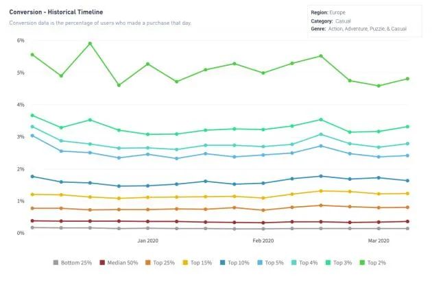 造成这种情况的原因不得而知,也许仅仅是因为玩家们在冒险游戏和其他适合长时间投入的游戏中花费了更多时间和金钱。从图表中我们可以看到这些游戏的转化率——无论是表现最好还是最差的游戏,它们都几乎没有发生剧烈变化。因此这与游戏类型有更大关联,而与游戏本身的受欢迎程度无关。