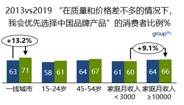 根据百度搜索,国牌标签在十年间成功转型,摆脱了低质、土味、无品牌力的标签,走向质量、设计、社会价值的进化。消费者对中国品牌的关注度由38%增长到70%。