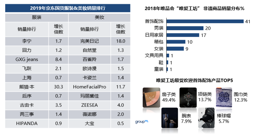 老品牌焕发新活力,淘宝上1200家老字号品牌搜索量增长23.8%。京东服装品类中,2019年国货品牌销量成倍增长;而在美妆领域,新生代品牌独占鳌头,完美日记借助小红书、电商直播在年轻女性中成功扩大影响力,成为国货美妆销量Top1。同时,非遗商品和汉服的销售规模不断扩大;线上博物馆类文创消费热度故宫IP稳居Top1,含金量最高,仅出售文创产品一年便可创造10亿销售额。