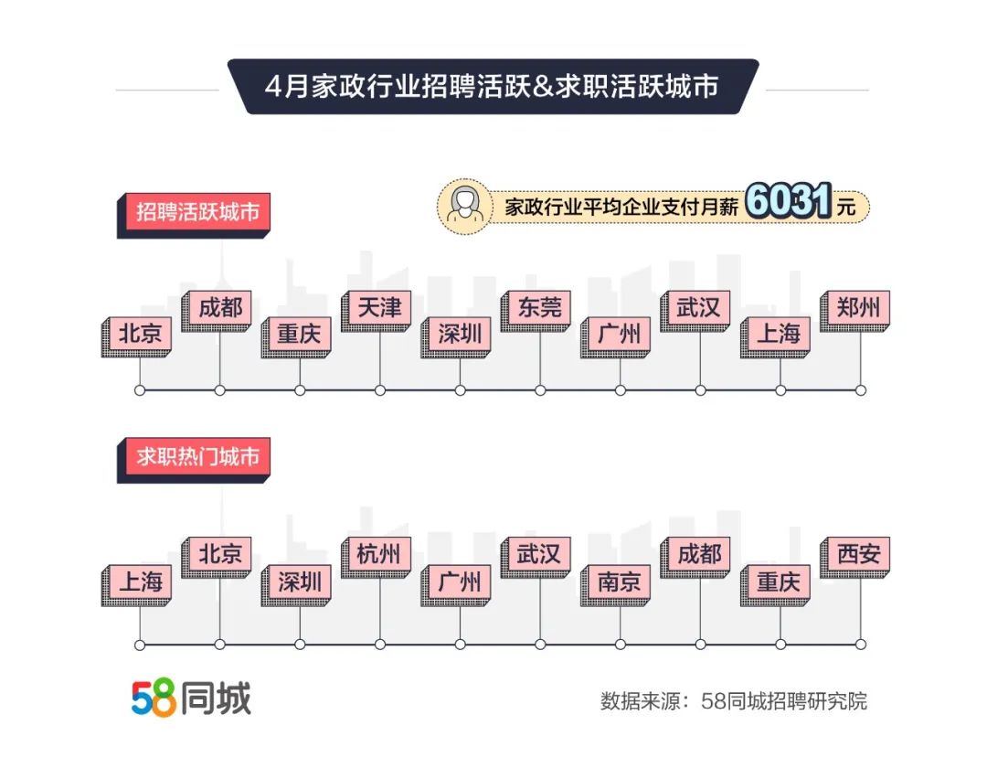 近日,58同城发布4月家政行业就业大数据,刻画了家政市场招聘求职情况。数据显示,今年4月,家政行业招聘需求环比上升15.28%,天津企业招聘需求环比增幅第一,达到61.43%;求职需求同比增长68.02%,家政行业平均企业支付月薪6031元,月嫂月收入排名首位、达到9699元。
