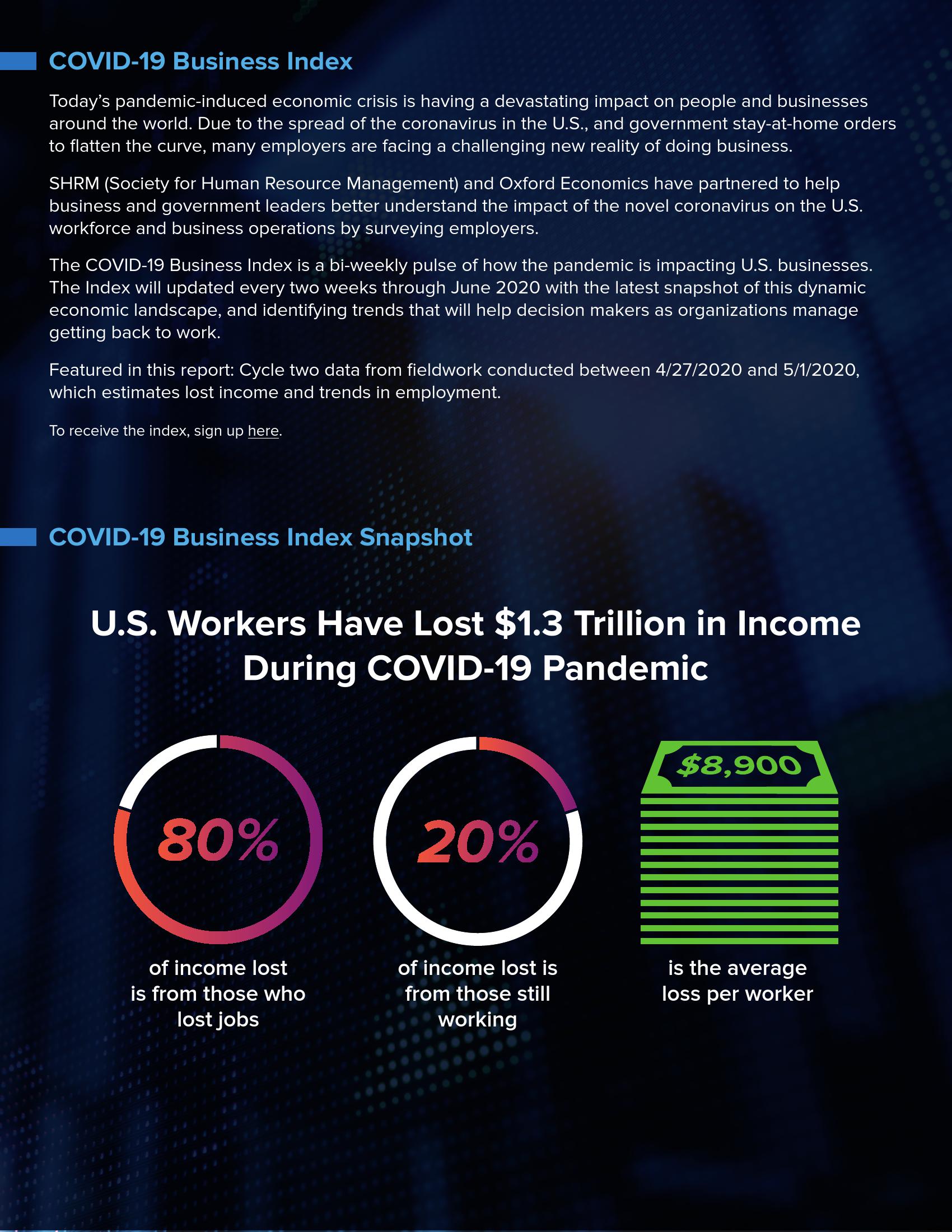 美国人力资源管理协会&牛津经济研究所最新研究显示,受新冠肺炎疫情影响,美国工人迄今为止已损失了总计1.3万亿美元的收入,平均每人近8900美元。