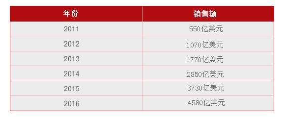 20、下图为2011年-2016年的中国电子商务交易总额一览: