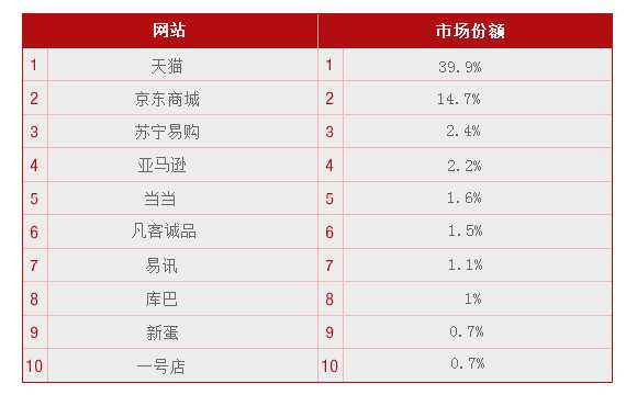 22、以下是中国十大电商网站,占整个市场的比重超过65%。