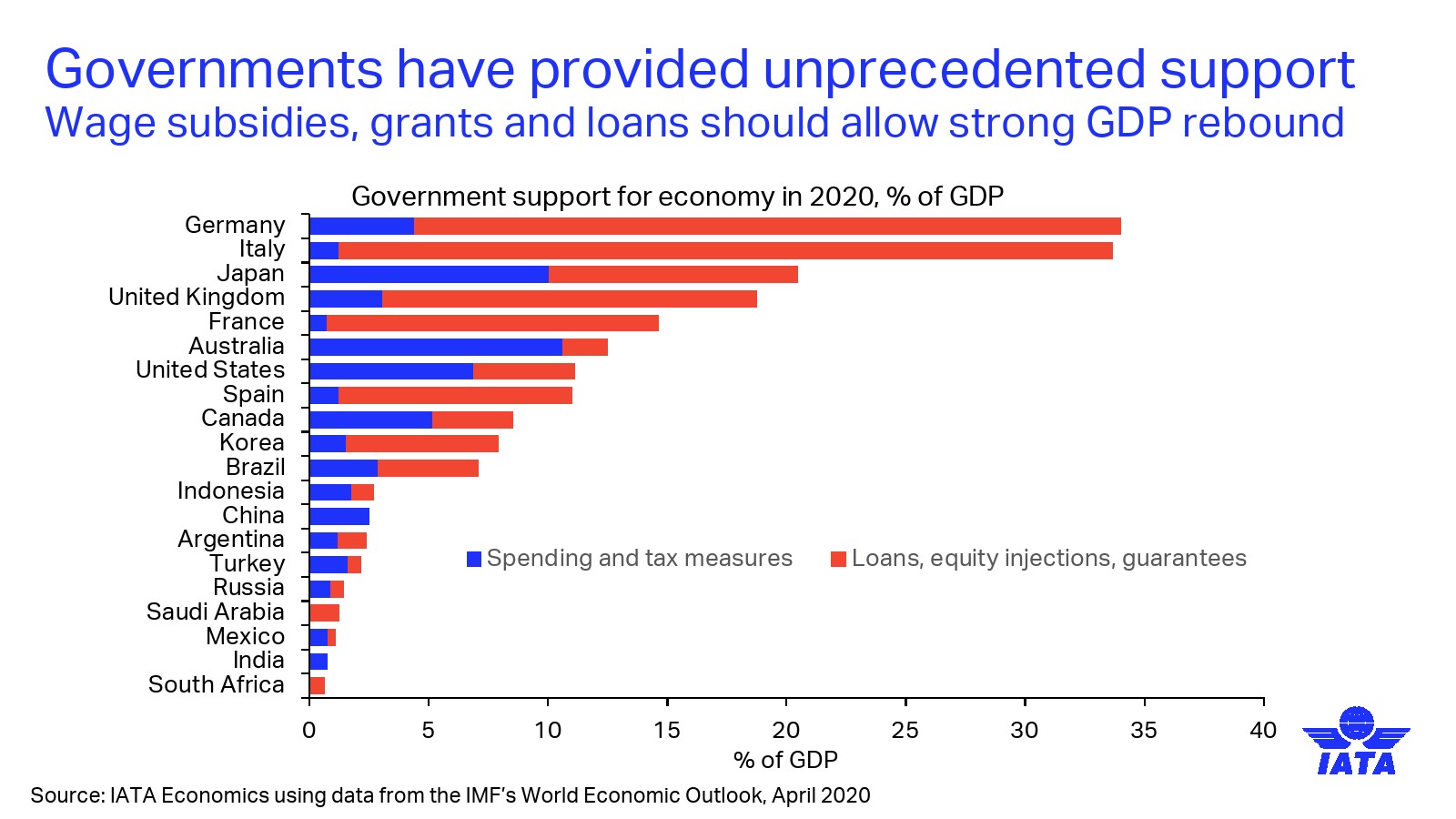 各国政府都为经济复苏提供了前所未有的支持,例如工资补贴、补助金和贷款。这些应该会让GDP在疫情之后强劲反弹。