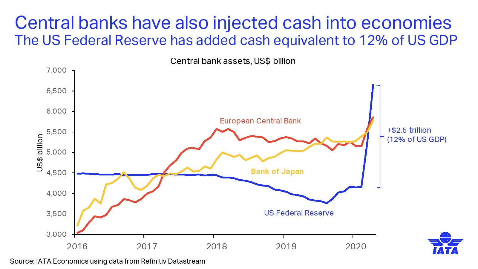 各国央行还向各经济体注入了现金。例如,美国联邦储备委员会(美联储/FED)增加的现金相当于美国GDP的12%。