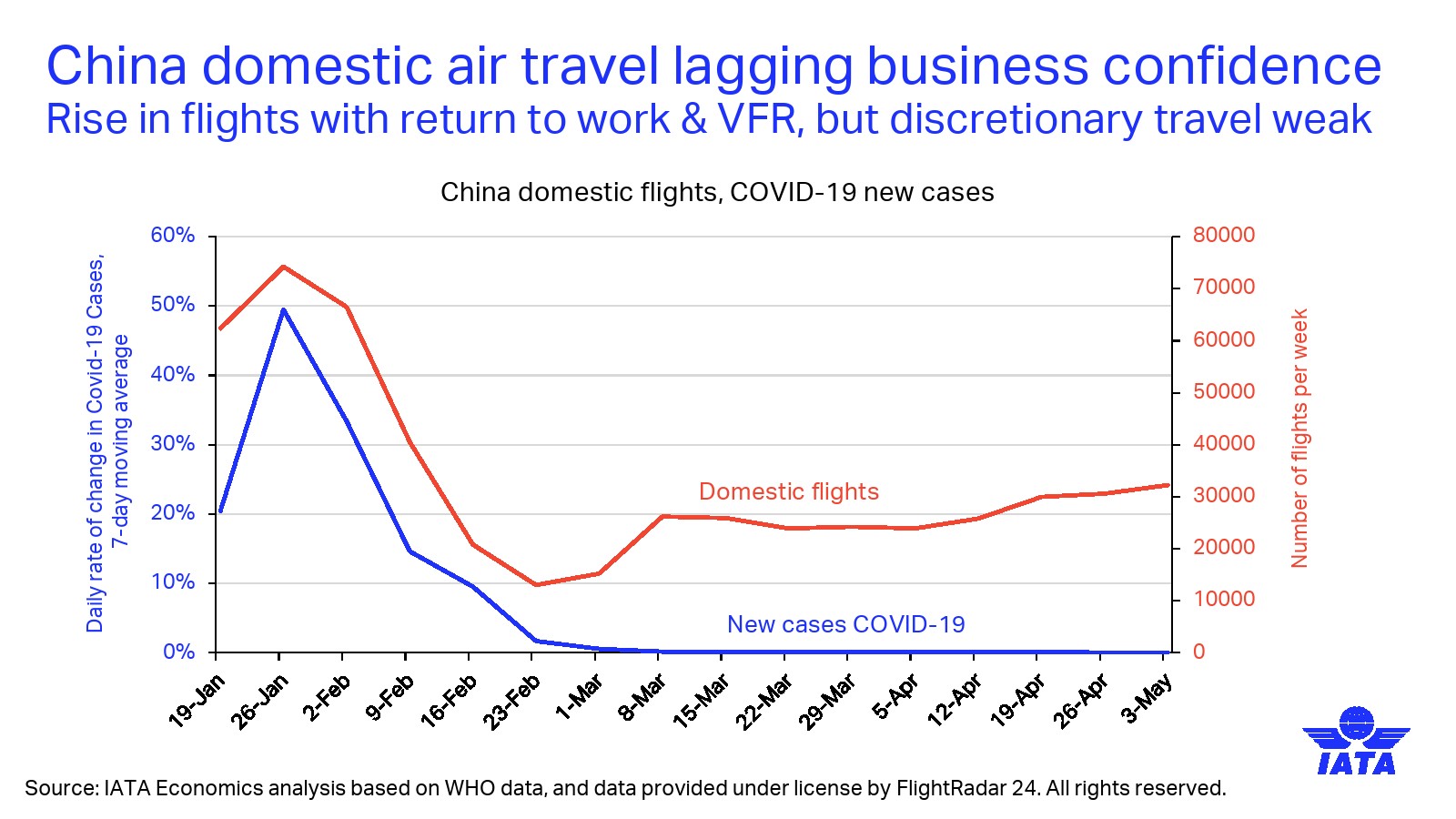 中国国内航空旅行业信心落后于其他行业,重返工作岗位和VFR(飞行计划)的航班增加,但自由行航空旅行仍然疲软。