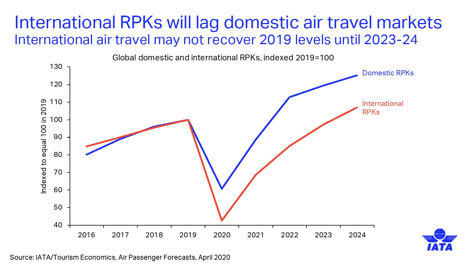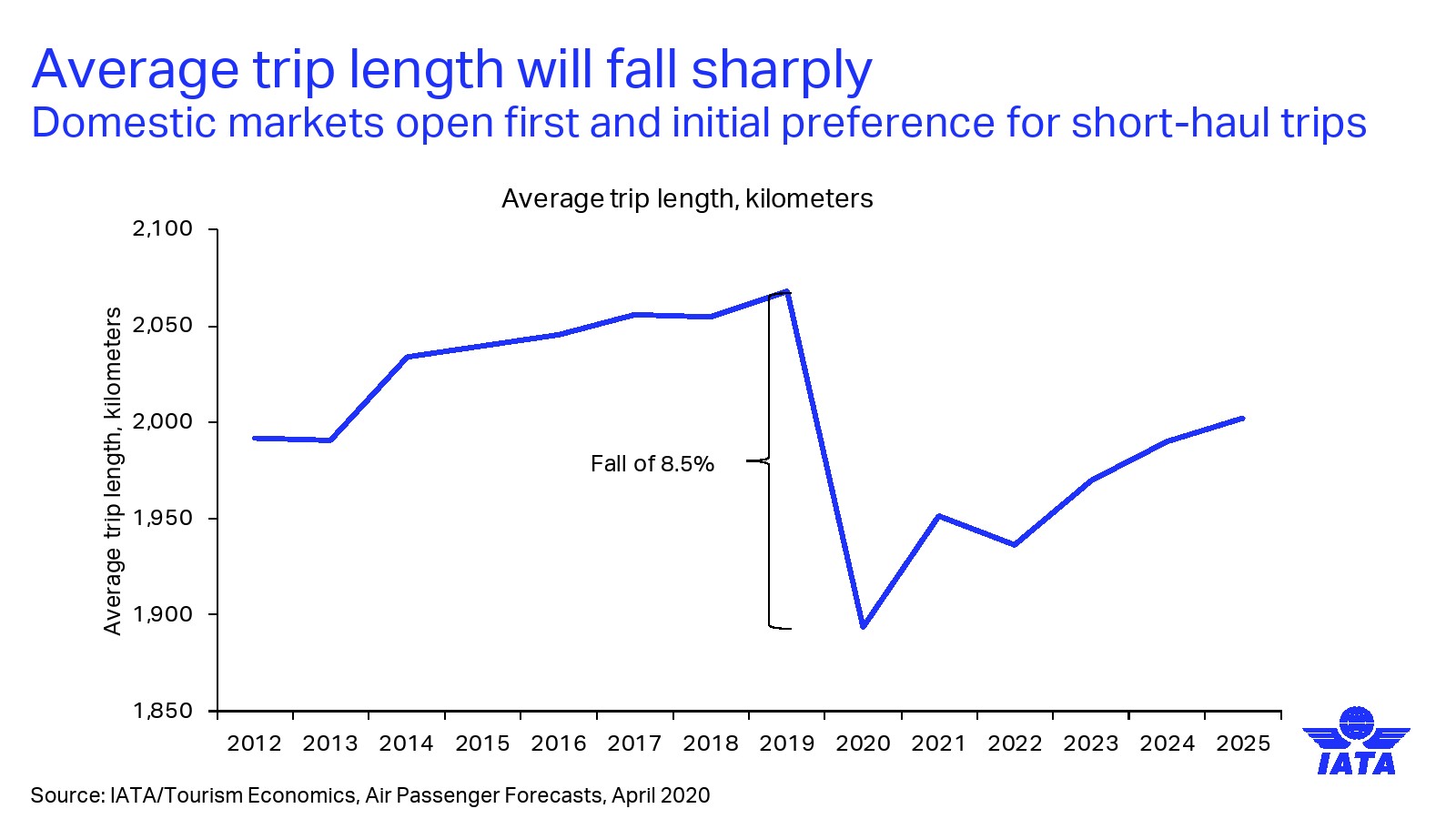 平均行程长度将大幅下降。最初,国内市场首先对偏爱短途旅行的消费者开放。但是,国际RPK将落后于国内航空旅行市场。