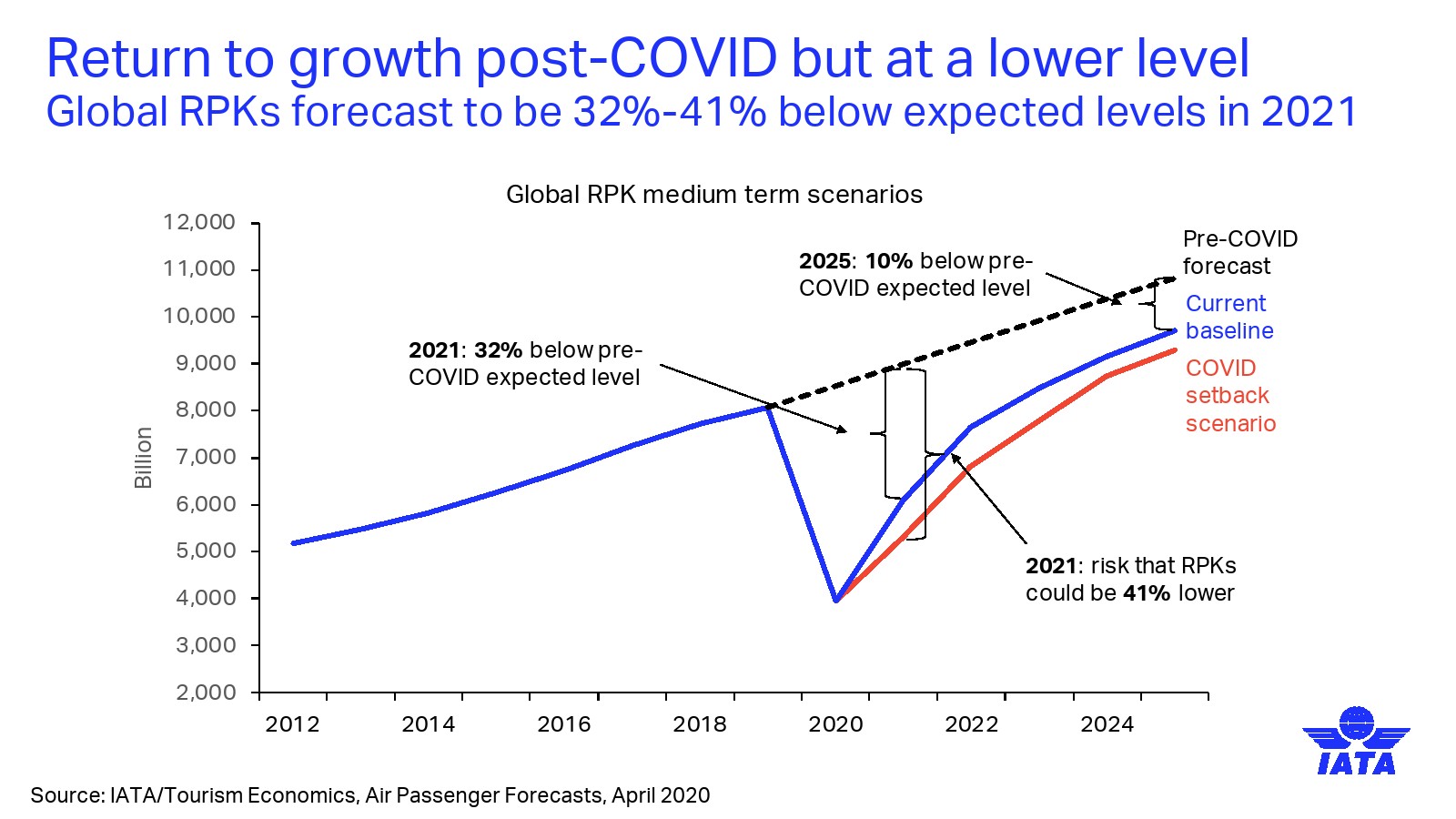 新冠状病毒之后航空业正在恢复增长,但处于较低水平。预计2021年全球RPK将比预期水平低32%-41%