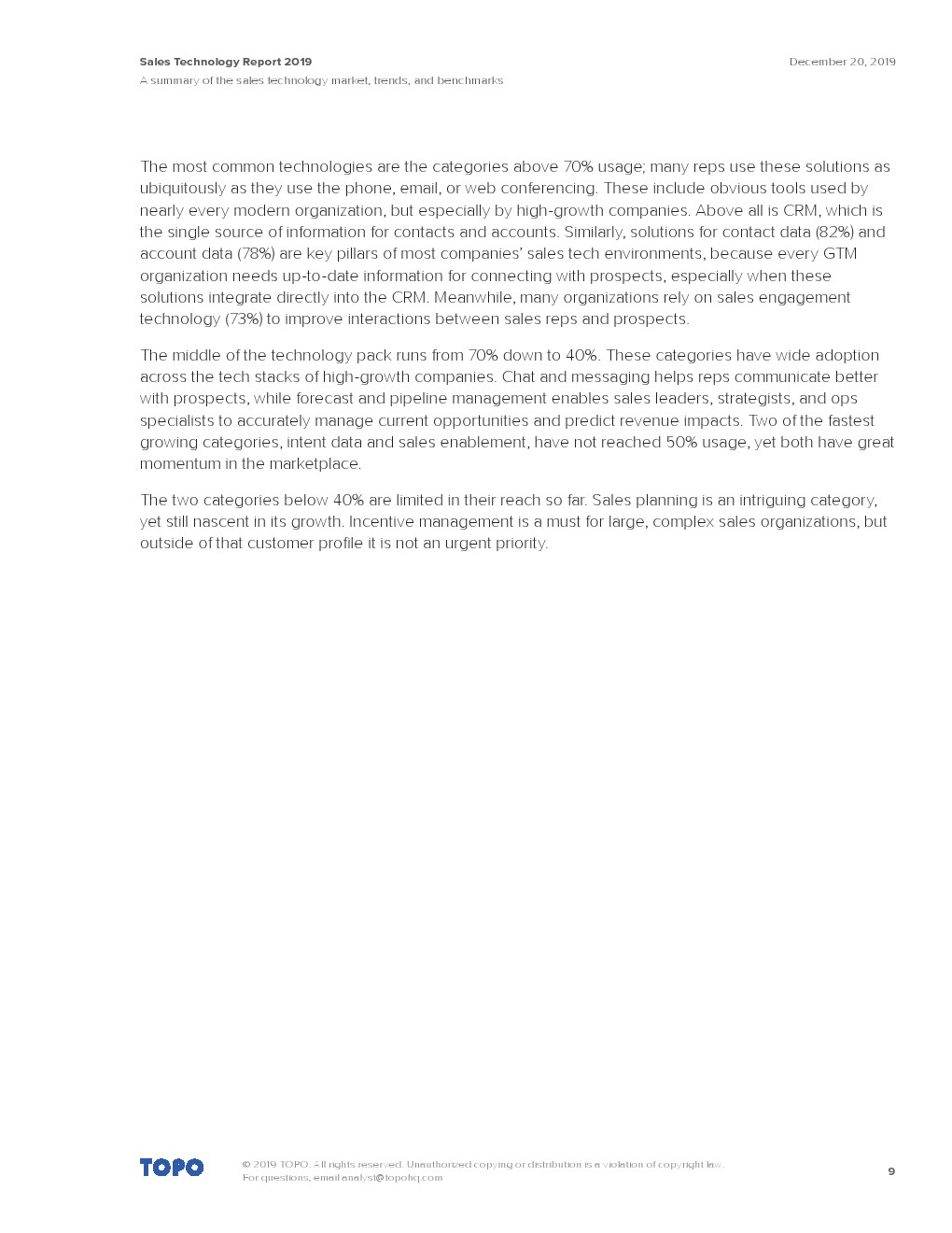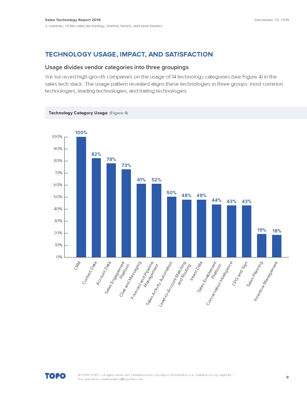根据Topo的一份报告,虽然并不是所有的公司都在使用CRM,但当涉及到高增长的公司时,CRM是无处不在的。销售技术的使用往往反映了营销技术的使用情况。