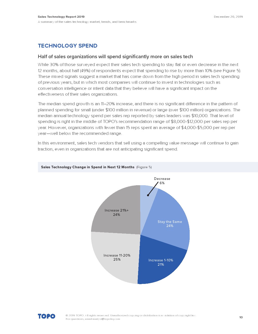 预计未来12个月内,约有70%的销售团队将在一定程度上增加其销售技术支出。一半的受访者(49%)预计这一支出将大幅增长(11%-21%之间),还有1/5的受访者(21%)预计这一支出将增长1%-10%。只有1/4的受访者(24%)预计他们的销售技术支出将保持不变,6%的受访者预计会减少。