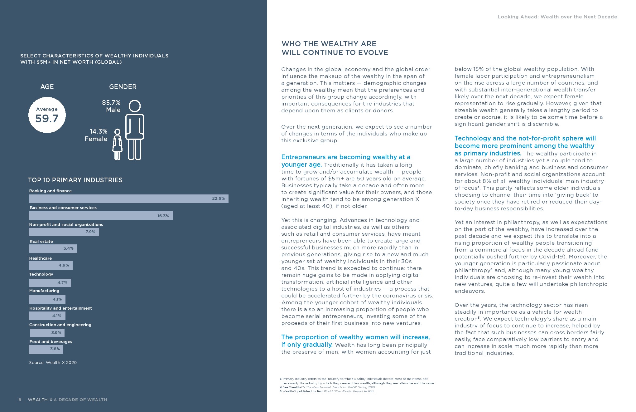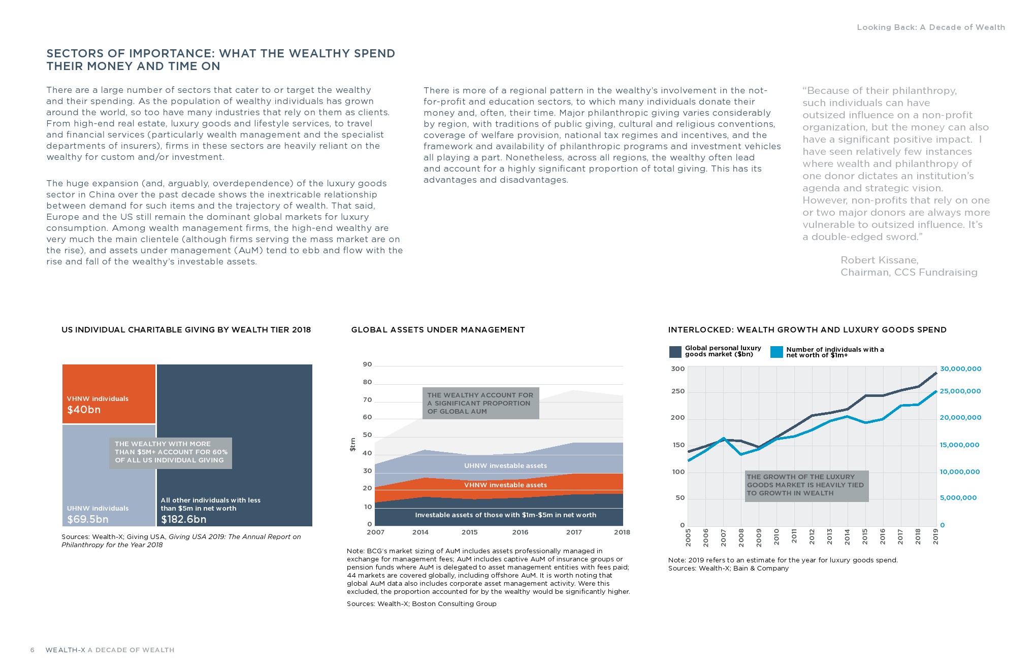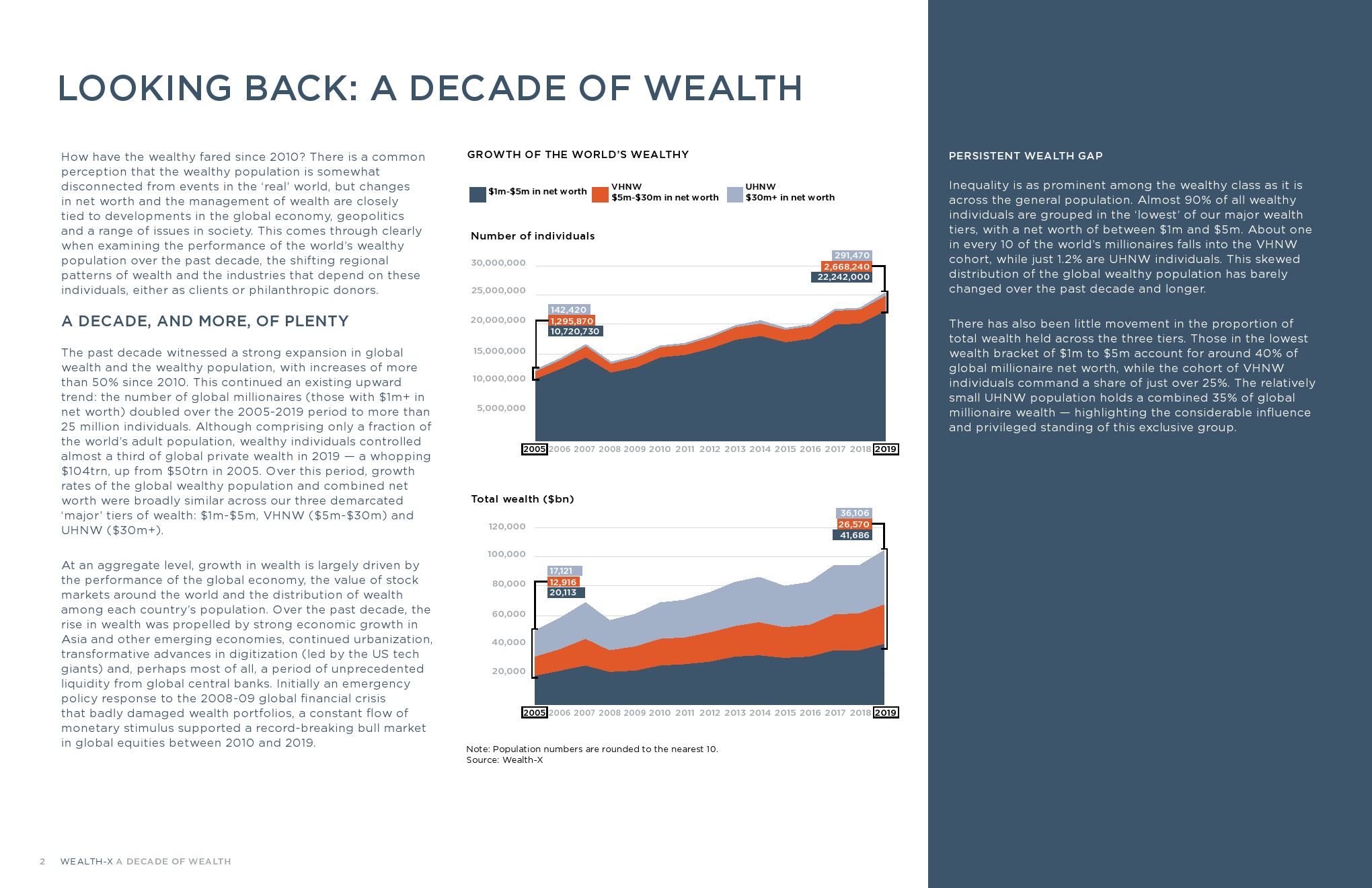 尽管富人只占世界成年人口的一小部分,但他们在2019年控制着全球私人财富的近1/3,达到104万亿美元,高于2005年的50万亿美元。WEALTH-X划分的三个“主要”财富阶层的全球富裕人口增长率和净资产总和大体相似:100万美元-500万美元、高净值人群(500万美元-3000万美元)和超高净值人群(3000万美元以上)。