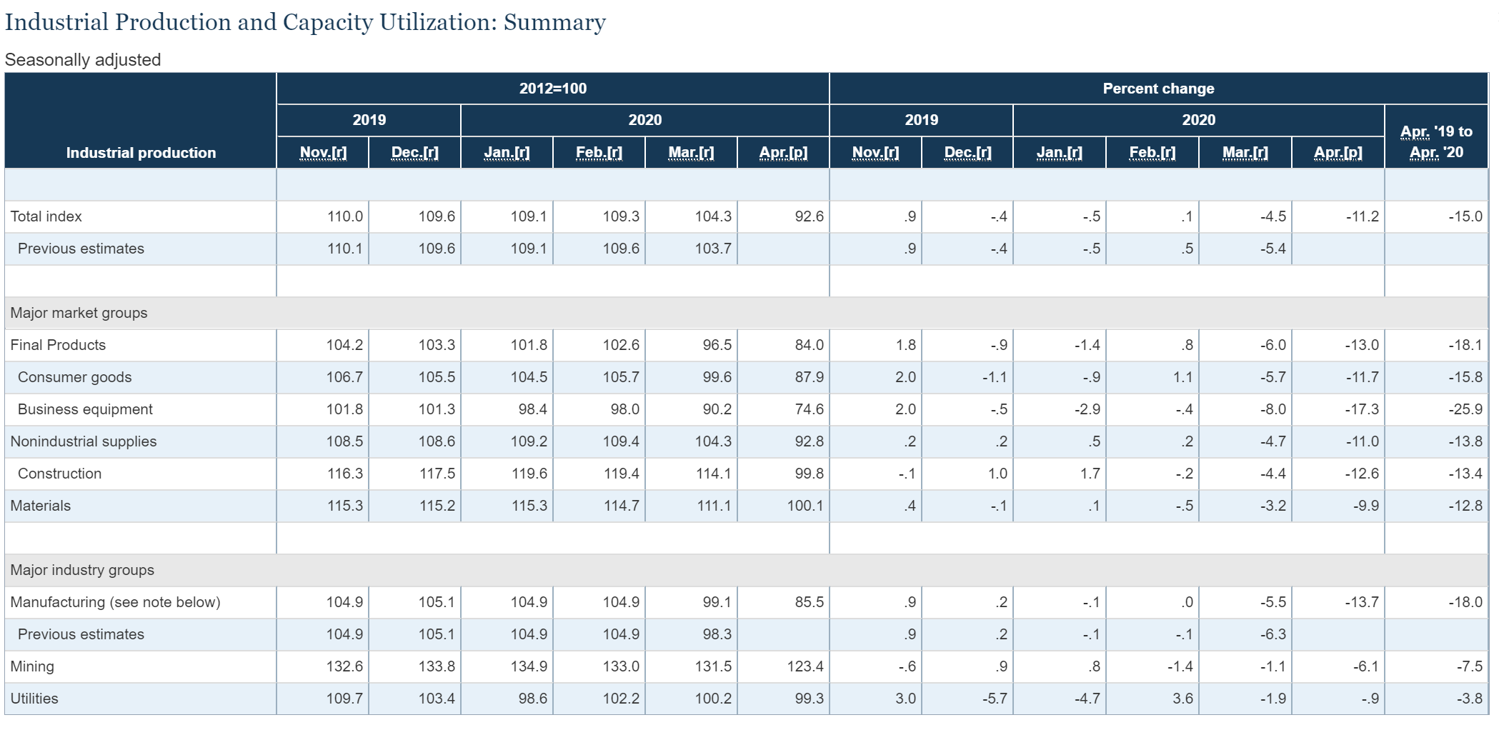 4月工业生产总值下降11.2%,为该指数101年历史上的最大月度降幅。制造业产值下降13.7%,也是有记录以来的最大降幅,所有主要行业都出现了下降。