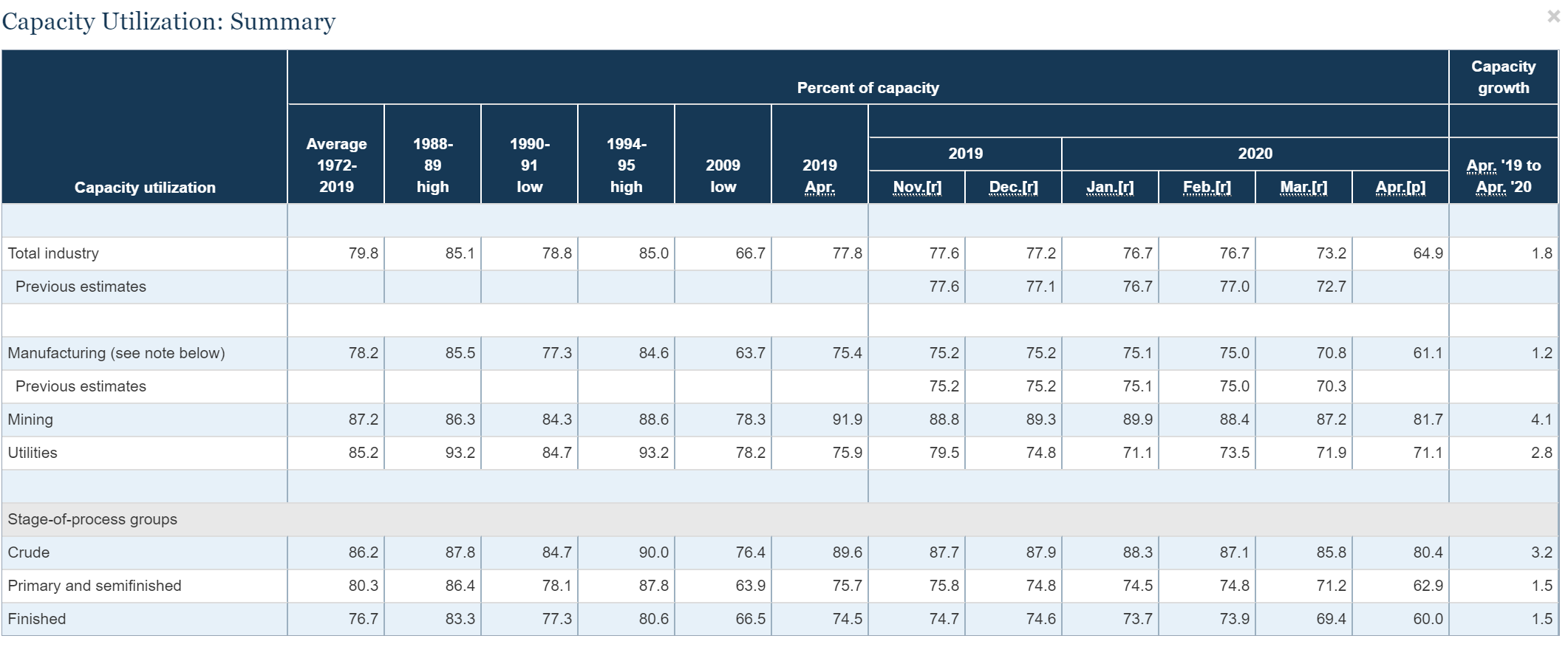 同期,制造业产能利用率为61.1%,比3月份低9.7个百分点,比2009年6月的衰退低点低2.6个百分点。耐用制造业的产能利用率也低于2009年的低点,降至55.3%。同样,非耐用品的产能利用率创下新低,下降6.1个百分点,降至68.0%。