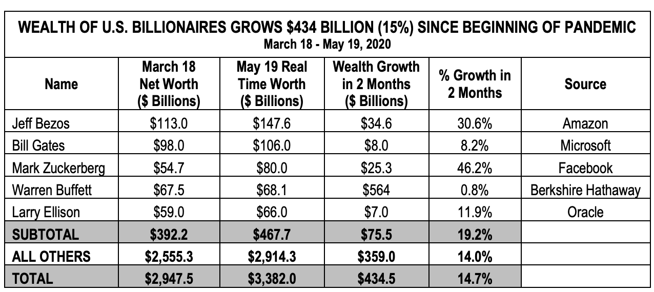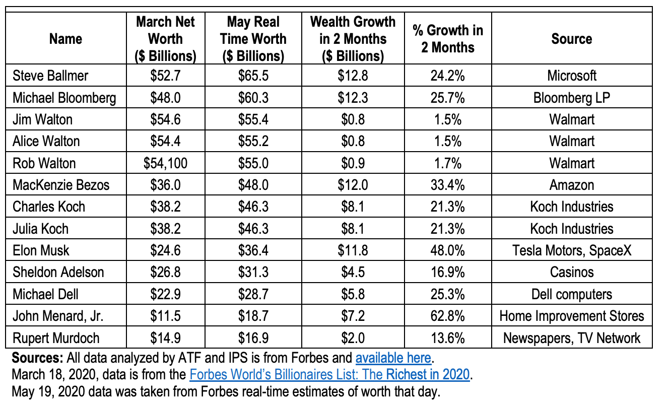 美国税收公平组织(Americans for Tax Fairness)和不平等计划政策研究所对《福布斯》的数据进行分析后发现,从3月18日大部分州开始疫情封锁到5月19日之间,美国600多位亿万富豪的总资产从2.948万亿美元增至3.382万亿美元,增幅达15%。