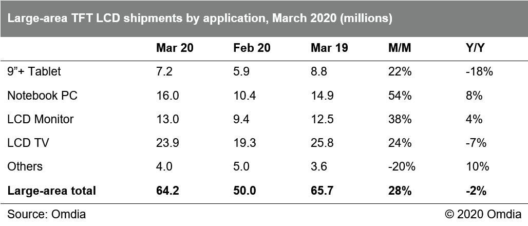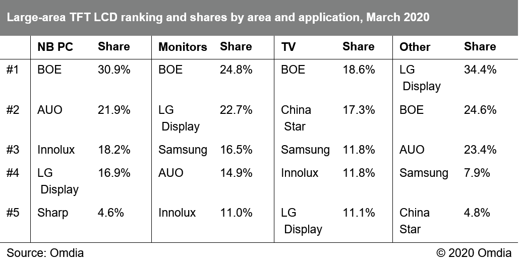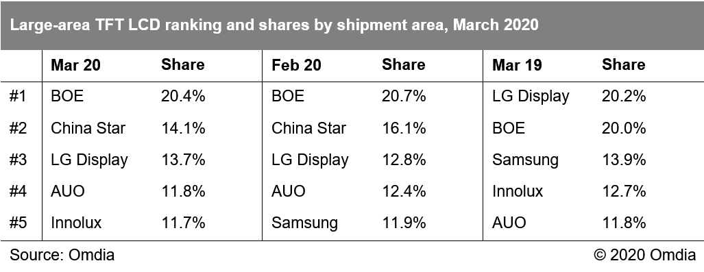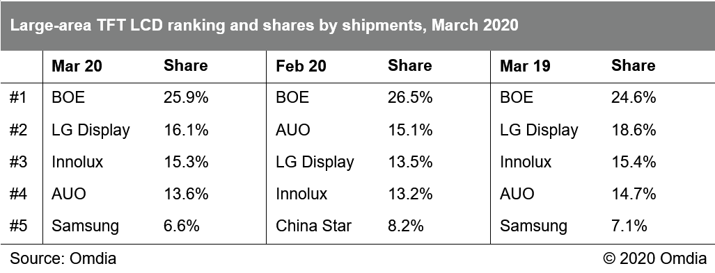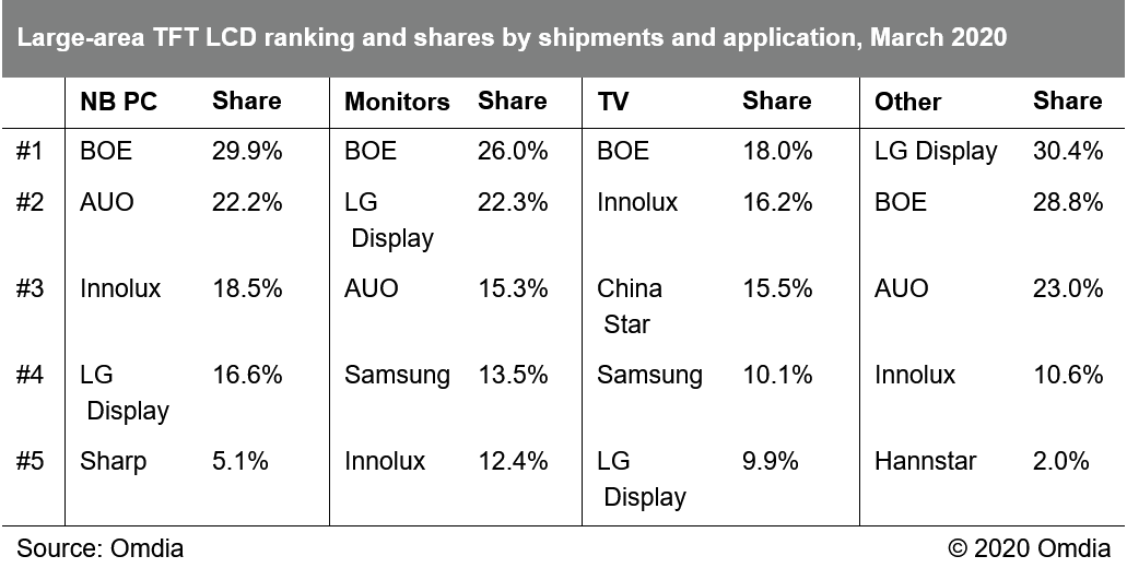 Omdia:2020年3月份大尺寸面板出货量达成6,416万片 据Omdia《大尺寸面板月度出货追踪报告》显示,3月份大尺寸面板出货达成6,416万片,相较上月大幅增长28%,不过仍较2019年3月同比略下降2%。由于春节假期、2月日历天数少以及新冠疫情影响的原因,2月份出货量是过去三年来的历史新低,仅略高于2016年2月份的出货表现。不过令人欣喜的是,随着中国大陆新冠疫情逐渐被控制住,供应链各相关企业相继复工,3月份大尺寸面板出货快速恢复。 不过,随着全球疫情大爆发,供应链对于需求下降的担心越来越大。有消息显示,韩厂有可能加速处置其TFT LCD产能,而其他区域厂商也开始考虑是否有必要在二季度进行稼动率调整,以维持得来不易的面板价格态势。有鉴于此,4月及后续月份,大尺寸面板出货还面临非常多的不确定性。 各应用出货情况,以及环比和同比增幅详情,请参阅下表。 出货排名:京东方占据全球大尺寸面板出货及出货面积第一 随着中国大陆近年的大量产能投资,中国大陆面板厂商在出货面积的市场份额一直持续稳定的提升。 随着2019年第四季开始的韩、台厂商大幅调低稼动率或者关停部分产能,中国大陆厂商的出货面积份额进一步提升。3月份,京东方、华星光电分别以20.4%和14.1%的出货面积份额,占据全球面板厂商大尺寸出货面积前二;中电熊猫、惠科和彩虹光电则分列第7、第8和第9位。 以出货量计, 京东方以25.9%份额占据首位,乐金显示、群创和友达以16.1%、15.3%及13.6%分列2~4位,而三星显示和华星光电则以6.6%、6.5%分列5、6位。 以出货面积计,京东方以20.4%份额占据第1,华星光电、乐金显示、友达、群创和三星则以14.1%、13.7%、11.8%、11.7%和11.4%分列2~6位。 下面两个表分列了按出货量及出货面积计算的市场份额情况及环比同比份额对比。 预计随着后续韩国厂商产能在2020年下半年继续关停及退出,大陆厂商的市场份额还会进一步提升。 下面两表则分列了按应用别的出货量及出货面积的市场份额情况。 更多阅读:Omdia:2020年4月份大尺寸面板出货量达成6344万片 环比下降2%Omdia:2024 年大尺寸面板出货量预计将同比增长 7.4%TrendForce:2014年6月大尺寸面板出货量达7178万片Omdia:2020年5月大尺寸面板出货环比上升16% 达到近年历史新高7,493万片Omdia:2008-2022年间液晶循环与需求弹性变化分析Omdia:2021年中小尺寸显示面板市场营收首次突破600亿美元Omdia:2020年3月份大尺寸面板出货达成6416万片 环比上涨28%Omdia:液晶电视面板价格,在2022年第一季度降至低点后预计将逐渐反弹Omdia:2022年桌上型显示器广视角面板发展趋势Omdia: 预计2021年全球显示玻璃基板持续紧缺Omdia:2022年OLED笔记本面板发展规划与展望Omdia:大尺寸屏幕显示驱动芯片紧缺将是长期的常态Omdia:中国半导体28nm工艺两年内有望实现产业链自给自主Omdia:预测2021年中国大陆面板厂将新增每月12万片的8.5代面板产能专注于IT面板生产Omdia:2020年7月份大尺寸面板出货环量达成7,920万片
