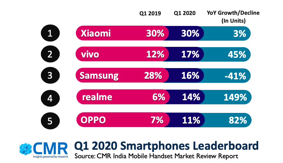 小米(30%)、vivo(17%)和三星(16%)位列2020年第一季度智能手机排行榜的前三名。realme和IQOO首次发布5G智能手机,realme X50 Pro占5G出货量的大部分。