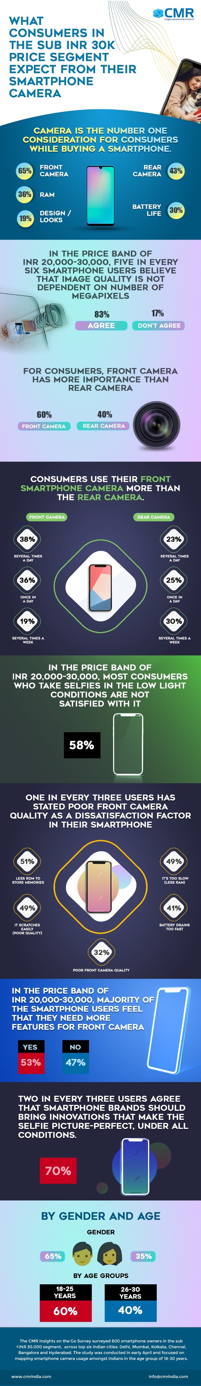 - 60%的用户对智能手机的前置摄像头感到满意。但是,价位在2万-3万印度卢比之间的智能手机用户中有36%对前置智能摄像头的质量不满;53%认为需要更多的前置摄像头功能。