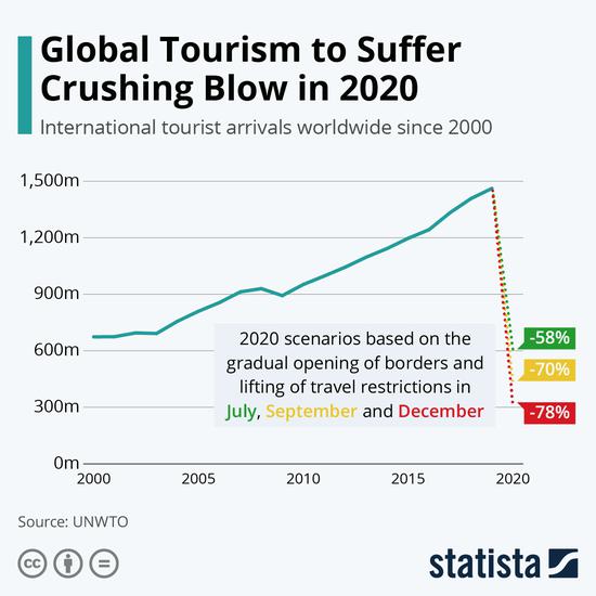 世界旅游组织:预计2020年国际游客人数达到6.1亿人 下降58% 根据世界旅游组织(UNWTO)数据显示,假设从7月开始各国逐步开放边境和解除旅行限制,预计今年的国际游客人数将下降58%,达到6.1亿人,这将使全球旅游业回到1998年水平。如果到今年12月才放松限制,国际游客人数将降至3.2亿人,这一水平上次出现是在上世纪80年代中期,旅游业可能因此损失1万多亿美元。 如图所示,在过去的20年里,国际航旅游客数量只下降了两次:2003年,SARS爆发导致游客人数下降了0.4%;2009年,全球金融危机导致国际旅游人数下降了4%。 更多阅读:联合国世界旅游组织:2015年国际游客人数达到11.84亿人次 同比增长4.4%世界旅游组织:全球旅游业最早2024年恢复至疫情前水平世界旅游组织:预计2021年全球旅游业因新冠疫情损失2万亿美元世界旅游组织:新冠疫情将使全球旅游业倒退20年世界旅游组织:2020年1-4月全球国际游客数量平均减少44% 收入减少1950亿美元世界旅游组织:2012年中国游客境外支出共花费1020亿美元世界旅游组织:全球旅游业恢复到疫情前水平的近90%世界旅游组织:女性参与旅游业的全球报告(第二版)世界旅游组织报告:旅游业气候行动世界旅游组织:2021年7月全球旅游报告全球旅游业概览: COVID-19相关的旅游限制世界旅游组织:2015年全球旅游报告(附完整版)世界旅游组织:全球女性参与旅游业报告世界旅游组织:2019年国际旅游报告世界旅游组织:预计2030年全球游客达到18亿