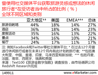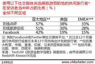 其它用户在网上所提供的信息和意见是亚太地区的休闲旅行者在计划旅行时最看重的因素,数字营销公司Text100所发布的《旅游业数字指数》调查报告指出,44%的亚太地区休闲旅行者使用社交媒体平台来寻求旅游目的地相关的建议和获取灵感,而在美国、欧洲、中东和非洲地区(EMEA)的旅行者当中,使用社交媒体平台来寻求旅游目的地相关的建议和获取灵感的旅行者比例仅为不到22%。另外,超过1/3的亚太地区休闲旅行者通过社交媒体来获得景点、度假活动和酒店等相关的想法和建议。该调查报告由市场调研公司Redshift Research在2012年10月完成。