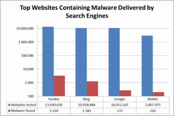这些数字很难用于比较,因此我们会说得快一点。恶意软件的出现率:Google为0.0025%,Bing为0.012%,Yandex为0.024%,Blekko为0.0067%。换言之,Google的成绩比必应(Bing)好上5倍、是Yandex的10倍。