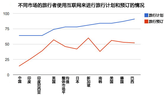 在线计划旅行的中国旅行者数量和在线预订旅游产品的中国旅行者数量之间的差距是最大的,2011年3月-2012年3月,64%的中国旅行者使用在线渠道调查旅行信息和计划旅行,然而仅14%的中国旅行者完成了预订。这一差距反映出结构性的因素和政治因素,包括中国的旅游市场受到严格的控制以及缺乏在线支付系统,这就使得中国旅行者难以通过在线渠道进行预订。