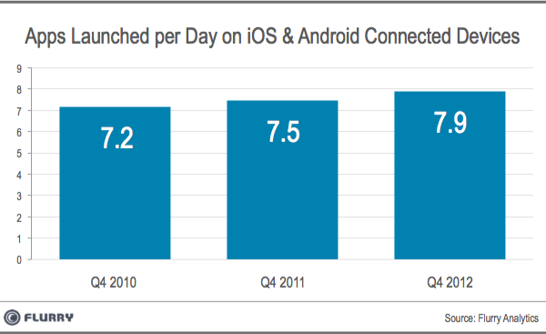 五年下来,随着手持装置数量不断成 长,App经济学(App Economy)的商机因应而生,华尔街日报也表示App收益每年上看250亿元。如此庞大的商机也造就各种App程序蓬勃发展。报告中针对2010至 2012这三年来,使用者每天开启的App数量做统计,从2010年的7.2个上升到2012年的7.9个。稳定成长所伴随的意义,也代表App市场尚未 达到饱和阶段。