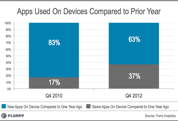 此 外,使用者对于App 应用程序的新鲜感依旧存在,下图分析2010 年与2012 年,手持装置上的App 程序相较于前一年的新、旧比例。2010 年时有17% 的程序在2009 年便存在,83% 为新增程序。到了2012 年,旧有程序比例上升到37%,而新程序下降为63%。
