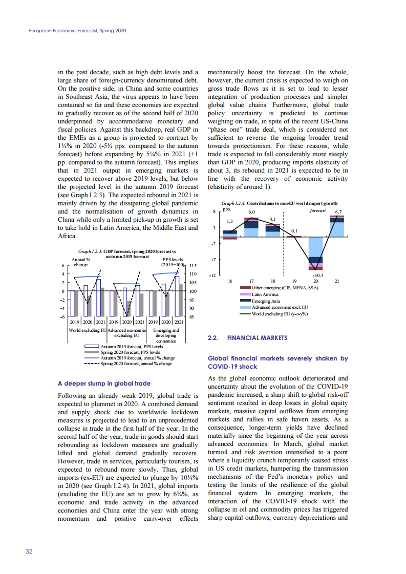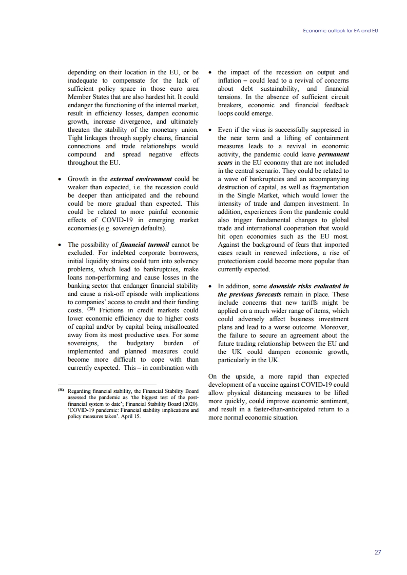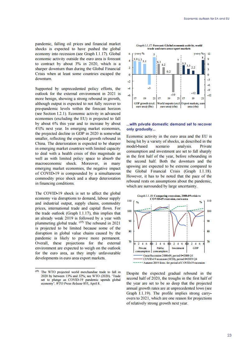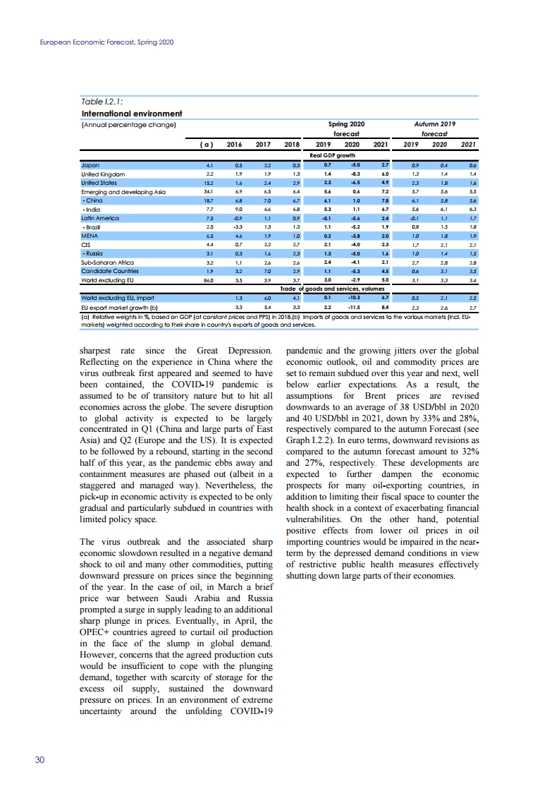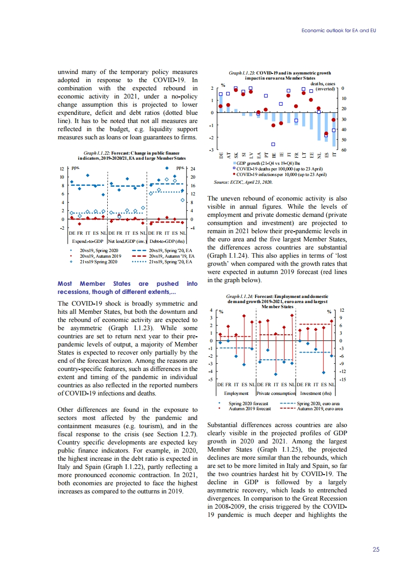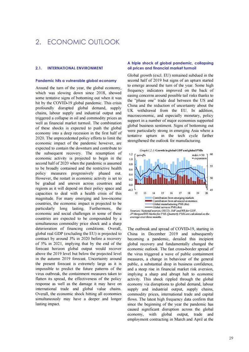 根据欧委会的预测,今年,欧元区19国经济会严重衰退;2021年回增6.3%;欧盟27国的国内生产总值今年将下跌7.4%,明年回增6%。预测报告称,大瘟疫给经济带来的冲击虽涉及所有成员国,但从波兰(-4%)到希腊(-10%),各国国内生产总值的降幅不尽相同。而来年的回升幅度也各不相同,总体上,无法弥补今年的损失。
