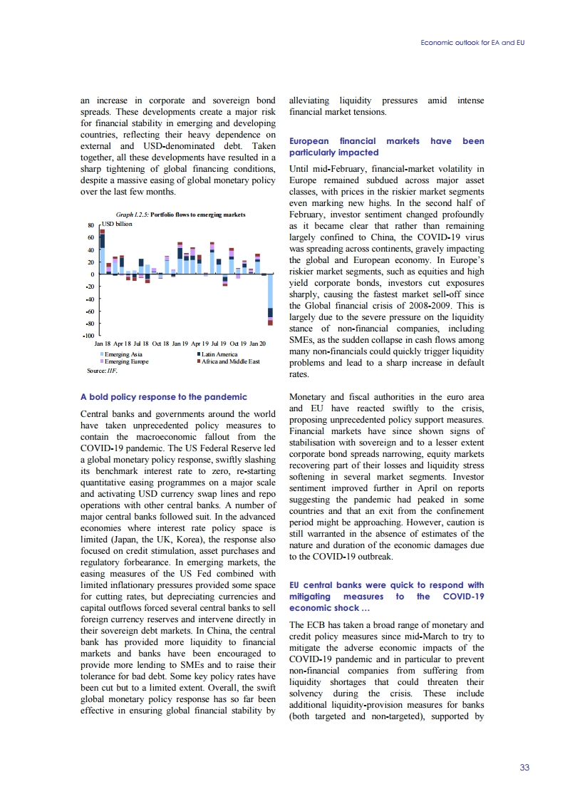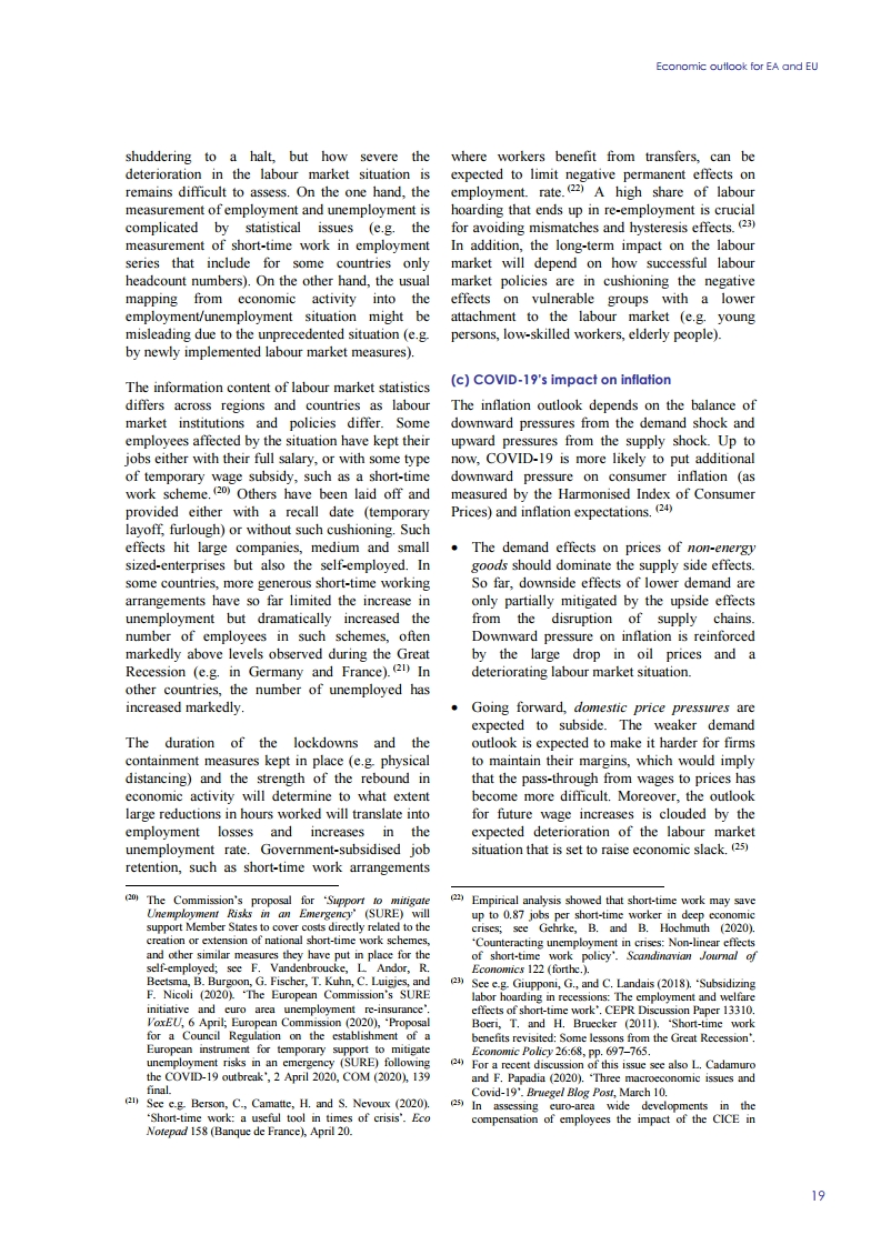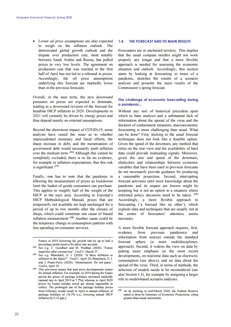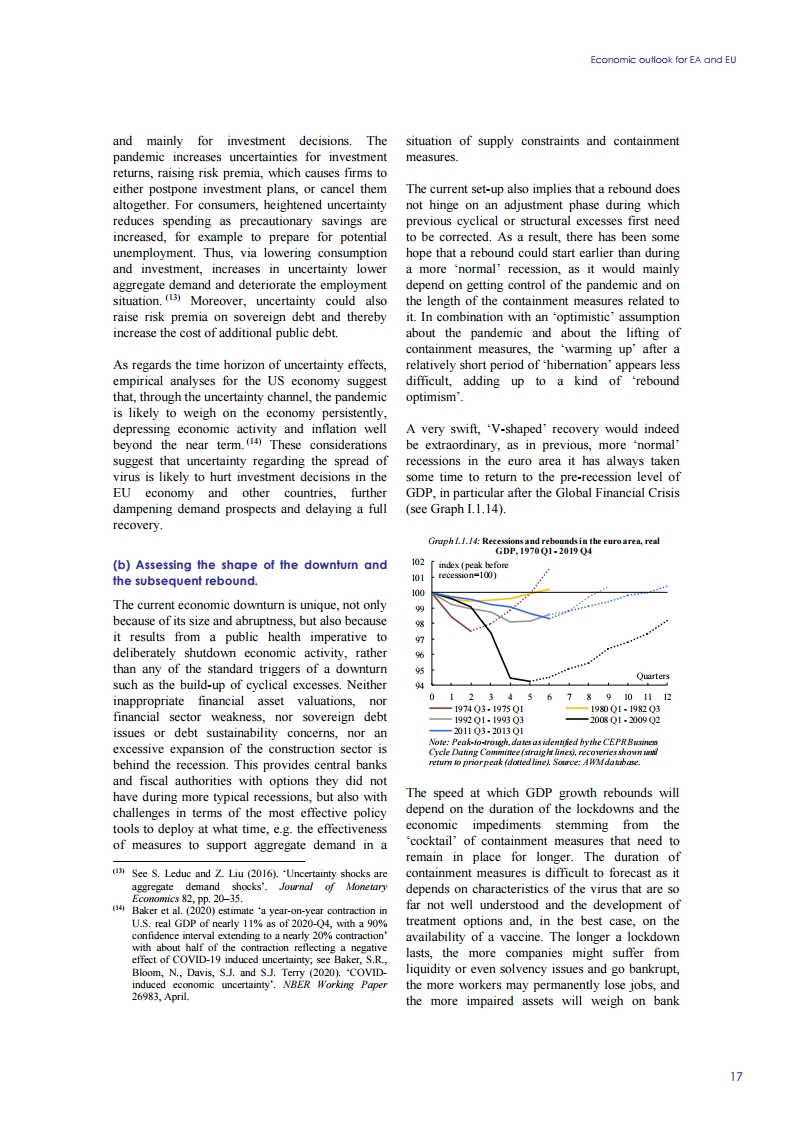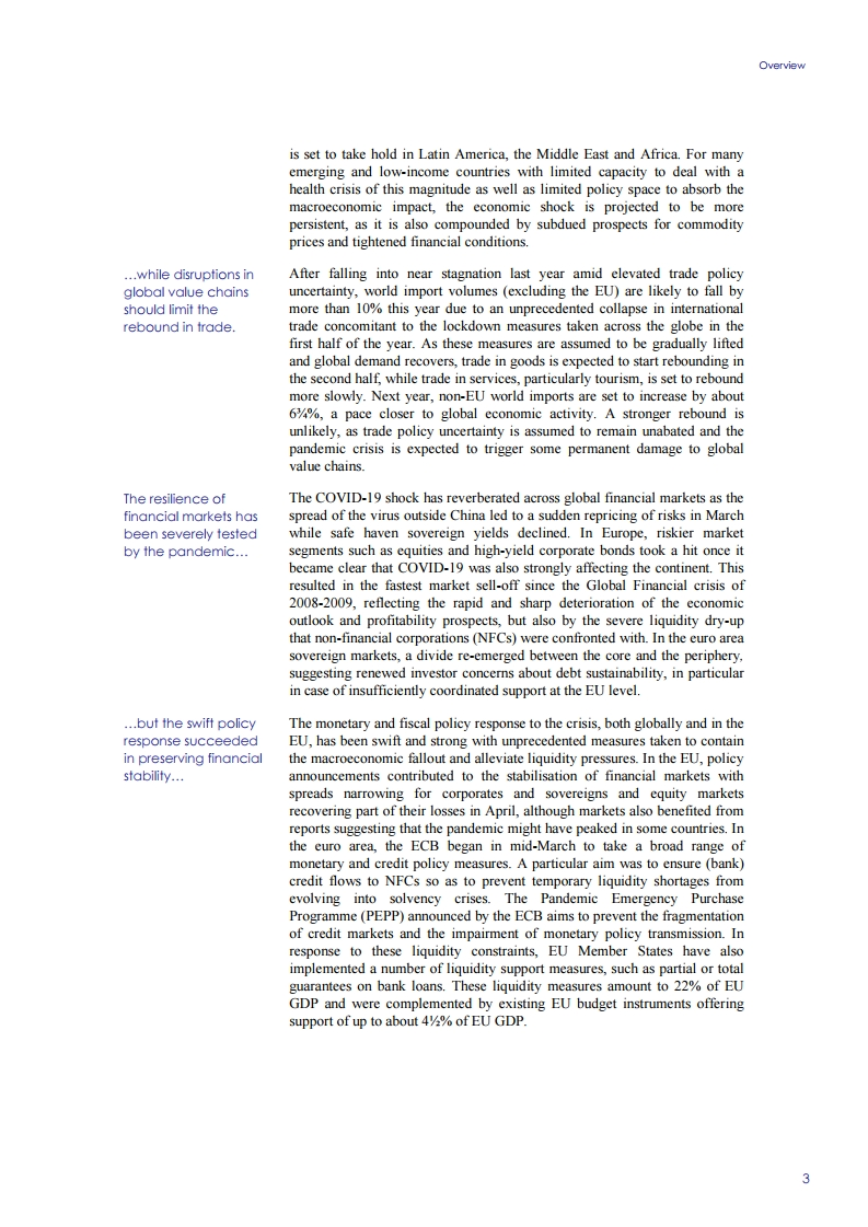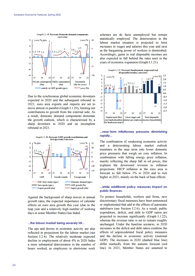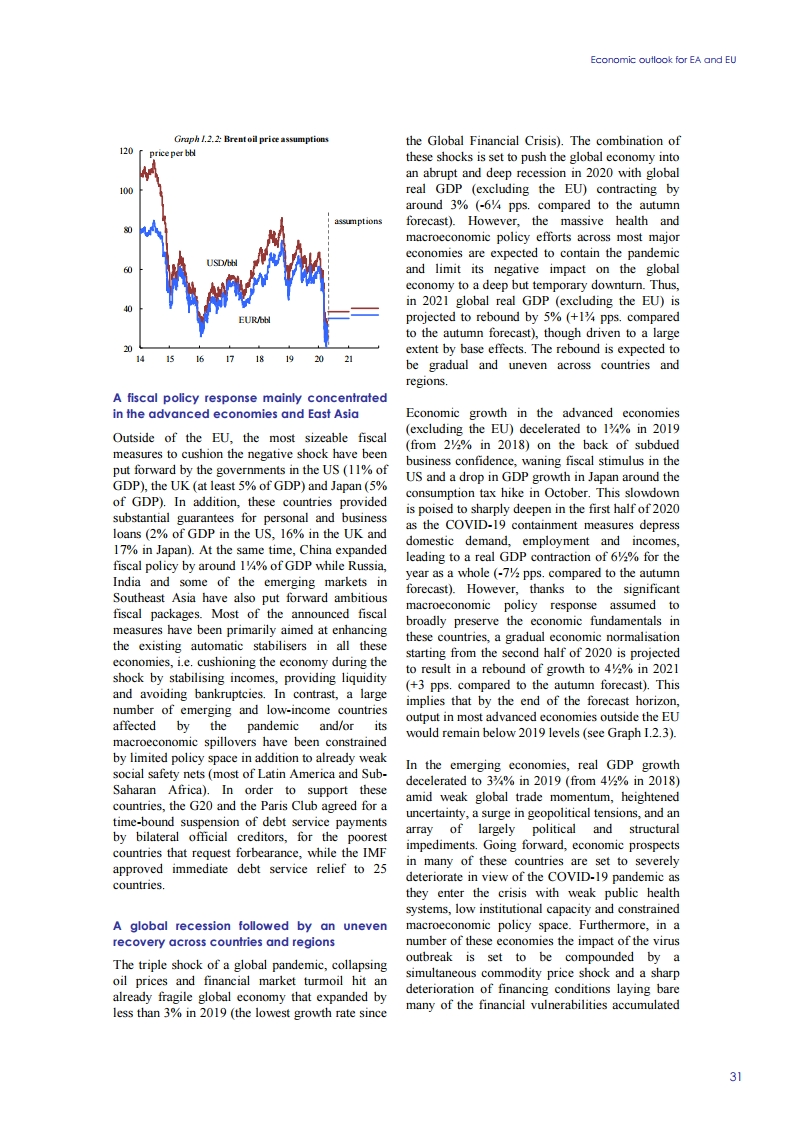 根据欧委会的预测,今年,欧元区19国经济会严重衰退;2021年回增6.3%;欧盟27国的国内生产总值今年将下跌7.4%,明年回增6%。预测报告称,大瘟疫给经济带来的冲击虽涉及所有成员国,但从波兰(-4%)到希腊(-10%),各国国内生产总值的降幅不尽相同。而来年的回升幅度也各不相同,总体上,无法弥补今年的损失。