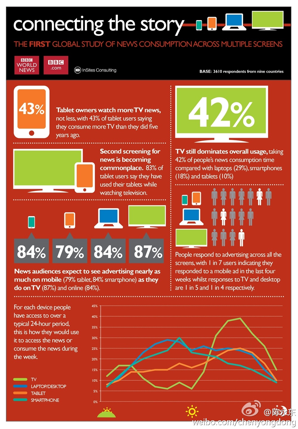 【不同设备看新闻的习惯不同】据BBC的研究数据:1)25~34岁的人是电视新闻的狂热爱好者;2)83%的人说他们看电视的同时会使用平板;3)电视占据了人们42%的看新闻时间, 笔记本占了看新闻的29%时间,智能手机占了18%,平板占了10%;4)晚上用有电视与平板看电视的人多,白天用笔记本及手机看的人多。