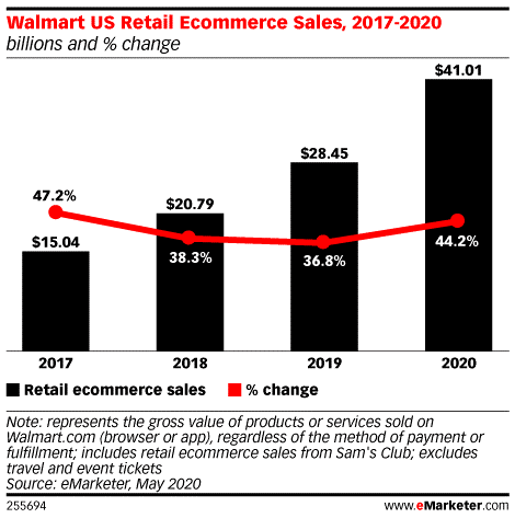 沃尔玛今年在美国的电子商务销售额预计将增长44.2%,达到410.1亿美元,比2019年增长36.8%,也比eMarketer 2020年1月的预测(27.0%)更高。