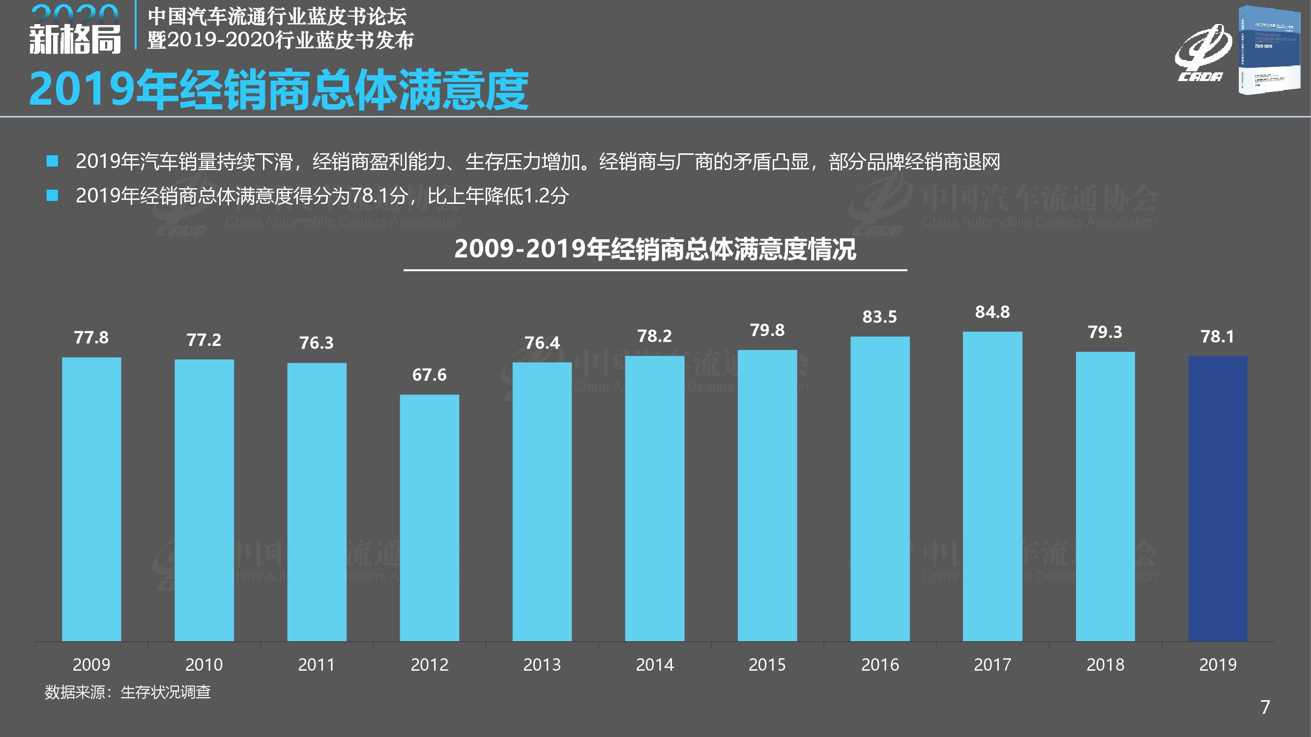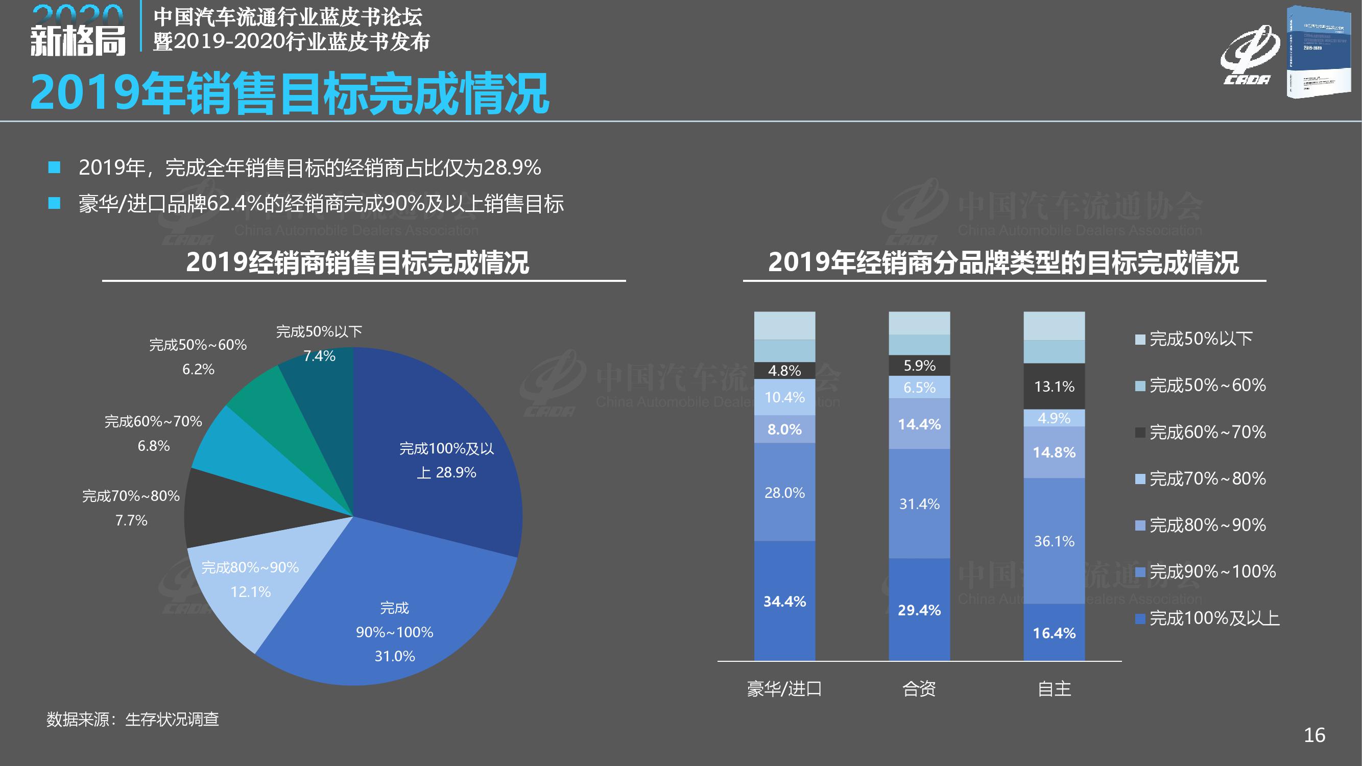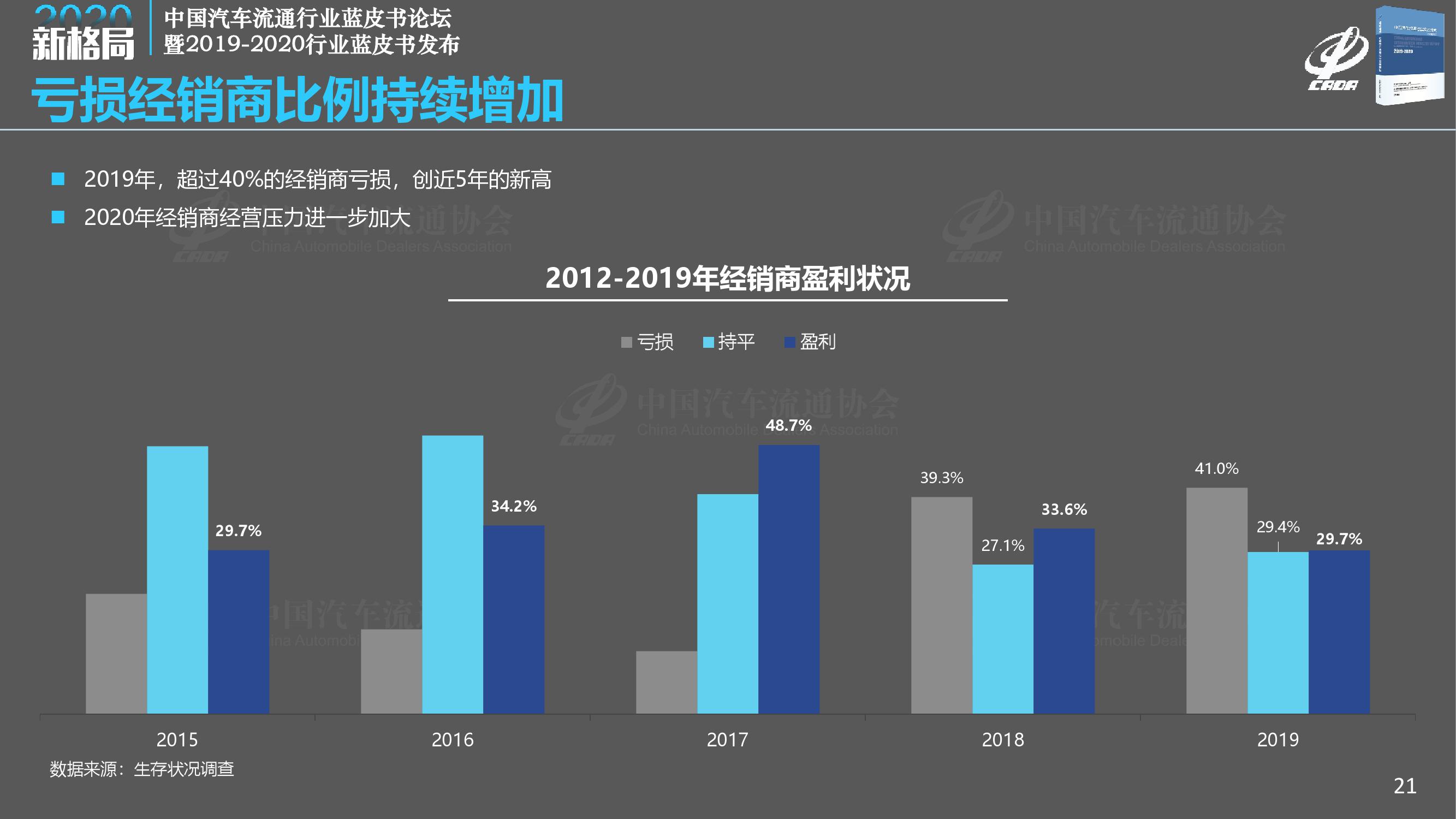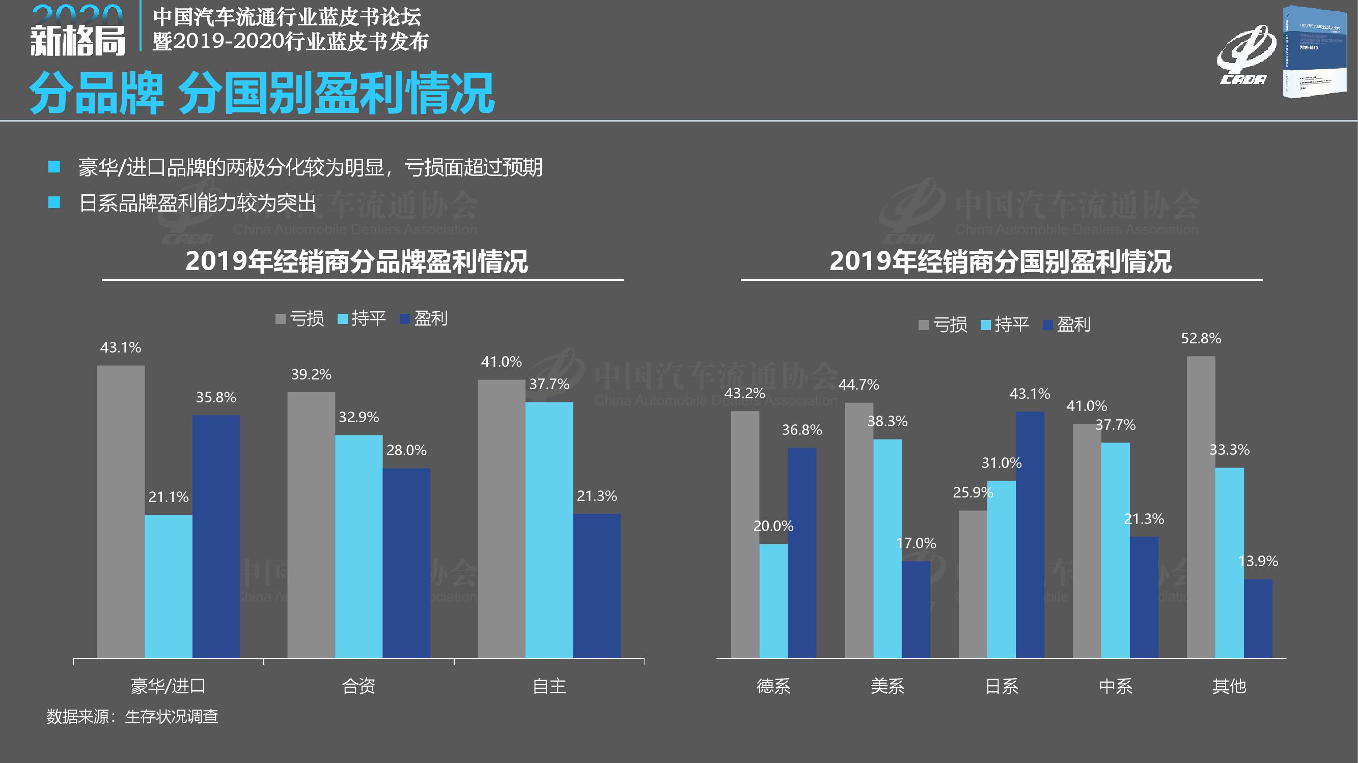 《报告》调查显示,2019年经销商总体满意度得分为78.1分,比去年大幅下降1.2分;2019年完成全年销售目标的经销商占比仅为28.9%,另有7.4%的经销商目标完成率在50%以下;相比2018年,2019年经销商的亏损面扩大至41.0%,亏损比例大幅增加,而盈利经销商比例减少至29.7%。