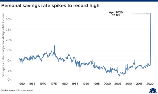 美国经济分析局周五表示,4月份个人储蓄率达到历史性的33%,是自该部门于1960年代开始追踪数据以来的最高水平。