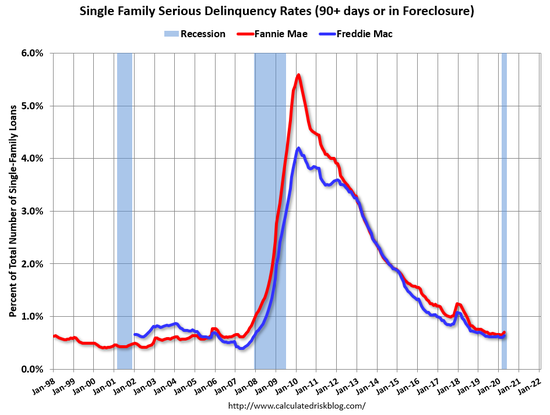房利美报告称,4月份,单户家庭严重违约率从3月份的0.66%上升至0.70%,略低于2019年4月的0.72%。该比率覆盖“三个月或以上的逾期或丧失赎回权”的抵押贷款。因此,新冠疫情的影响需要三个月的时间才能在这系列抵押贷款中显现出来。